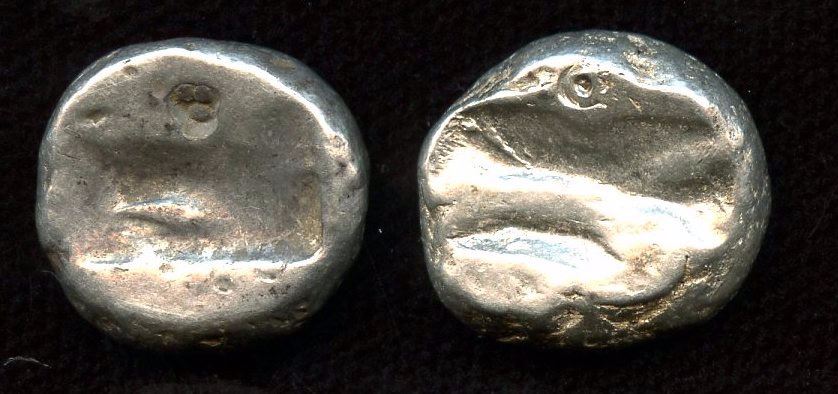 Persian king running r. holding bow and spear. Rev: Incuse punch. Sear-4682 -- (5.51g) aVF, banker's mark on obv; (5.44g) aVF, banker's mark on rev. 2 Pcs