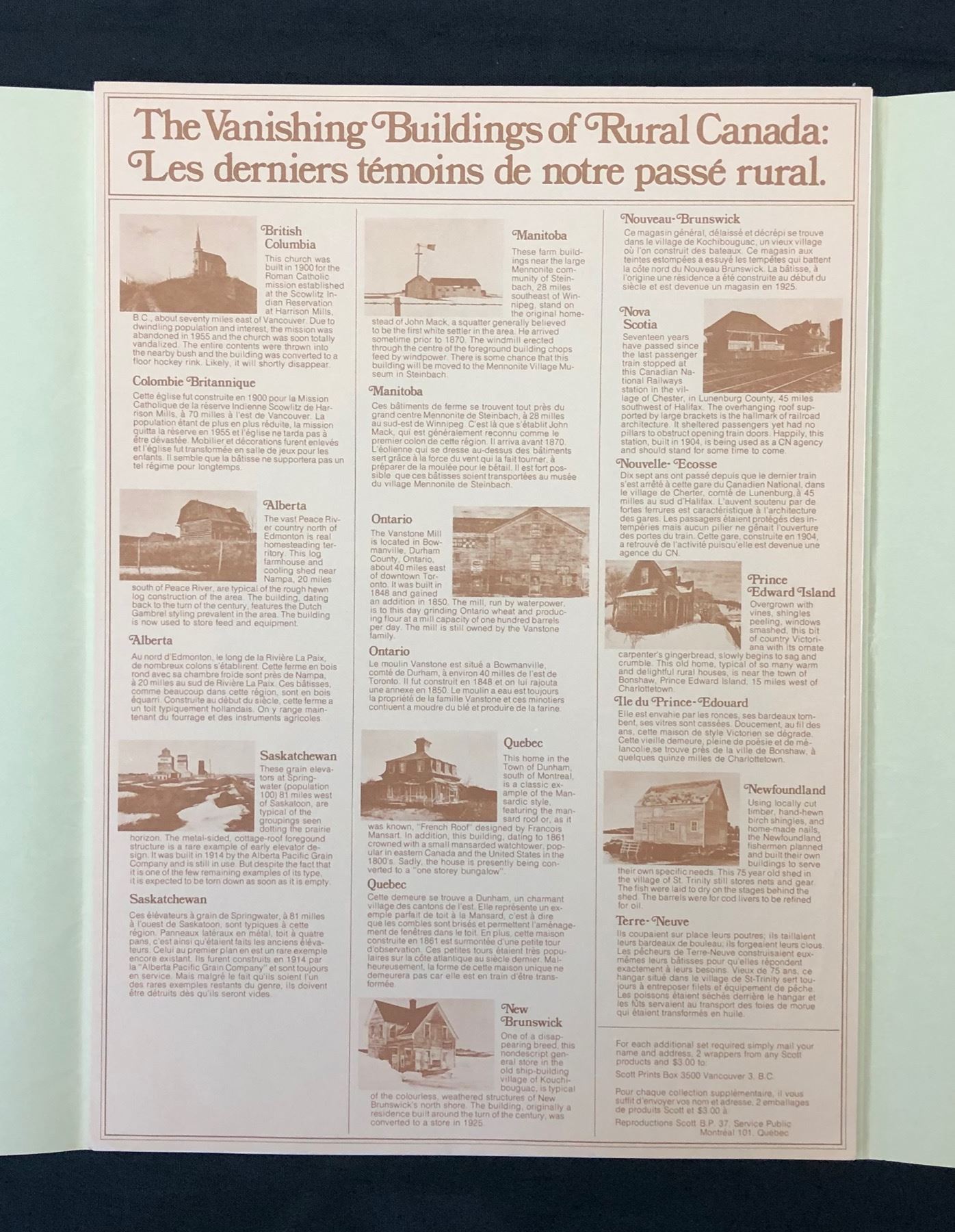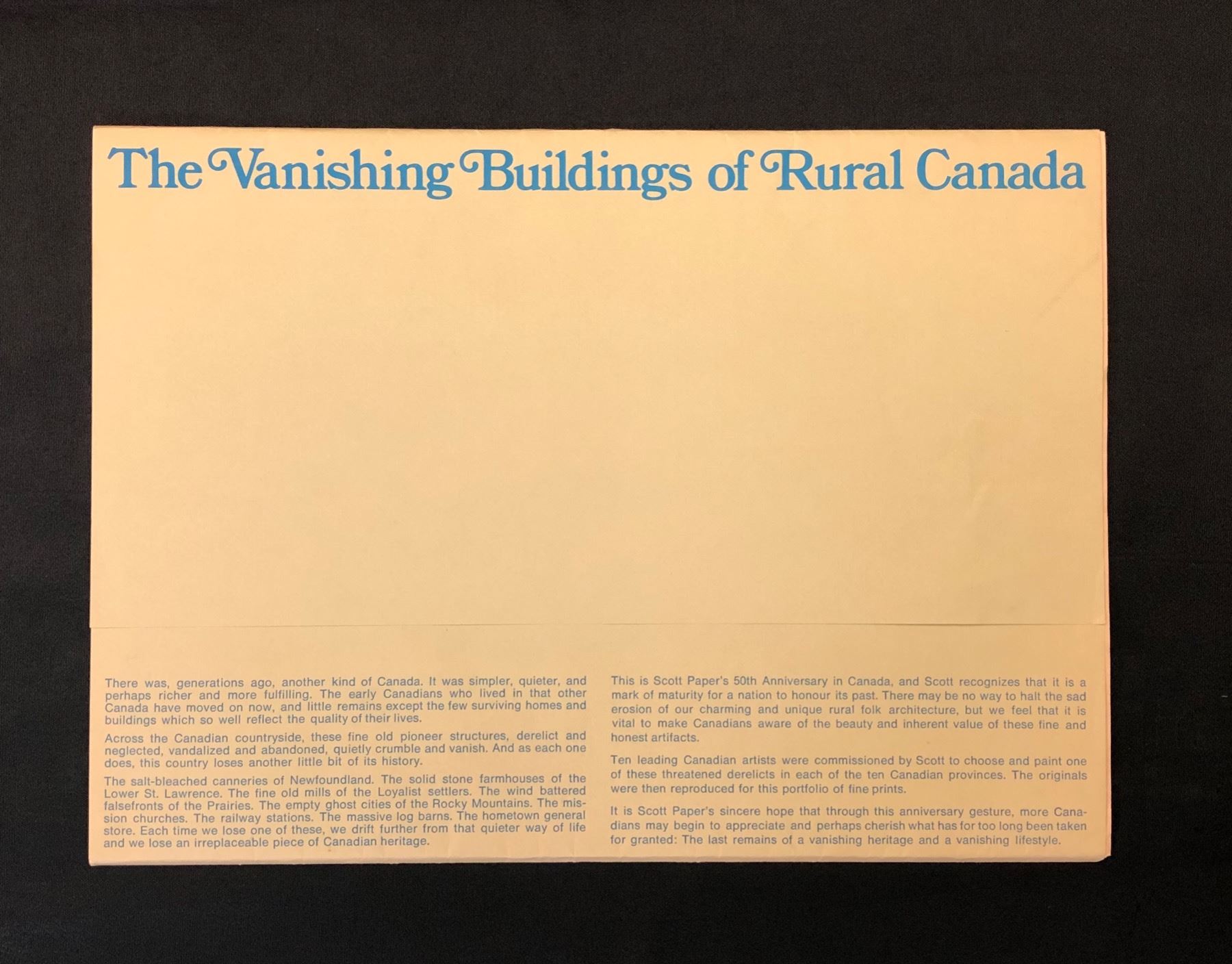 A portfolio of 10 prints of Vanishing Buildings of Rural Canada done by well-known Canadian artists. There is a print from each province. They are on art stock, 12x16 inches and in full color. We recommend viewing this delightful collection.