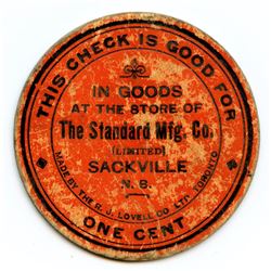 Obv: This Check Good For / One Cent / In Goods / At The Store Of / The Standard Mfg. Co. / (Limited) / Sackville / N.B. / Made by the R.J. Lovell Co L