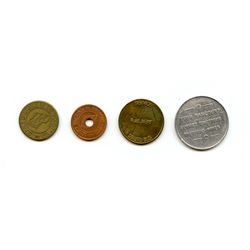 Quebec Transportation Tokens. Lot of 4 Thetford Mines tokens. 925A, Thetford Mines Inc, brass, child, EF; 925C, Thetford Mines Inc., Adult, centre hol