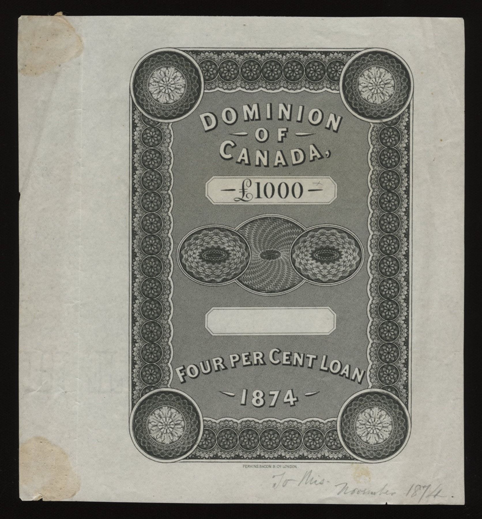 Perkins, Bacon & Co. portions of engraving for Dominion of Canada bonds: £1,000 and £100 1874, £500 1876, £500 1879. All have pencilled instructions for alterations. All have been removed from previous mounting, the 1876 £500 being damaged in the process. Four items.