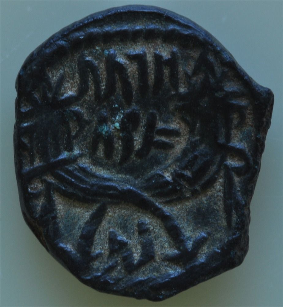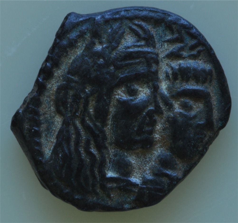 Petra (9-40 AD) - AE-17 Aretas IV Obv: conjoined hds., r. of Aretas and Dr. bust of Shuqailat. Rev: Two cornuacopiae crossed Aramaic legend 3.5 grams S-5699 Mesh 112, Fine.