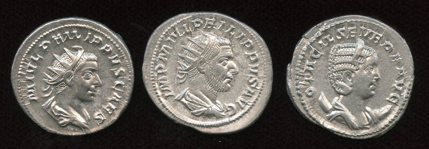 Philip I (4.15g) Rev: Victory advancing r., holding wreath and palm branch. RIC 49b; EF/aEF || Otacilia Severa (4.21g) Rev: Hippotamus stg. r. RIC 130; aEF/gVF || Philip II (4.08g) Rev: Philip II stg. l. with captive at feet. RIC 219; gVF. 3 Pcs.