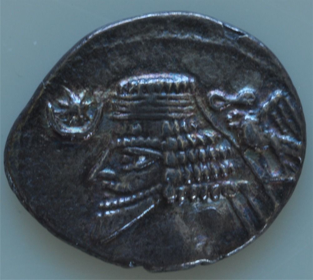 Phraates IV (38-2 BC) - AR-Drachm Obv: Diad. and cuir. bust l. with pointed beard, eagle r. wreath, crescent and star l. 3.1 grams Shore 999 Sellwood 54.7 Nicely toned EF.