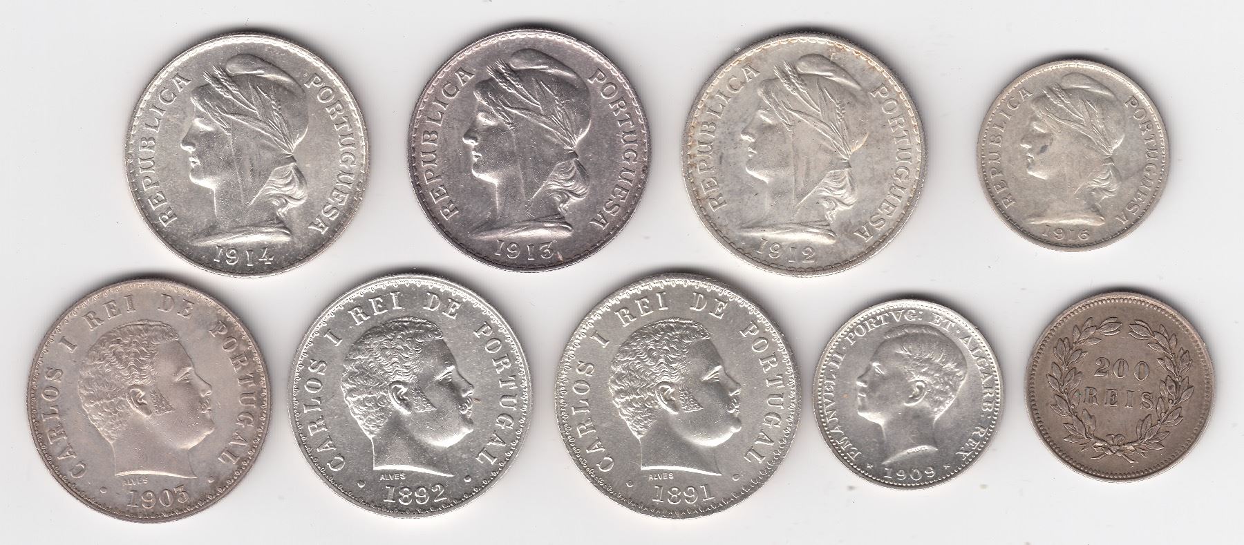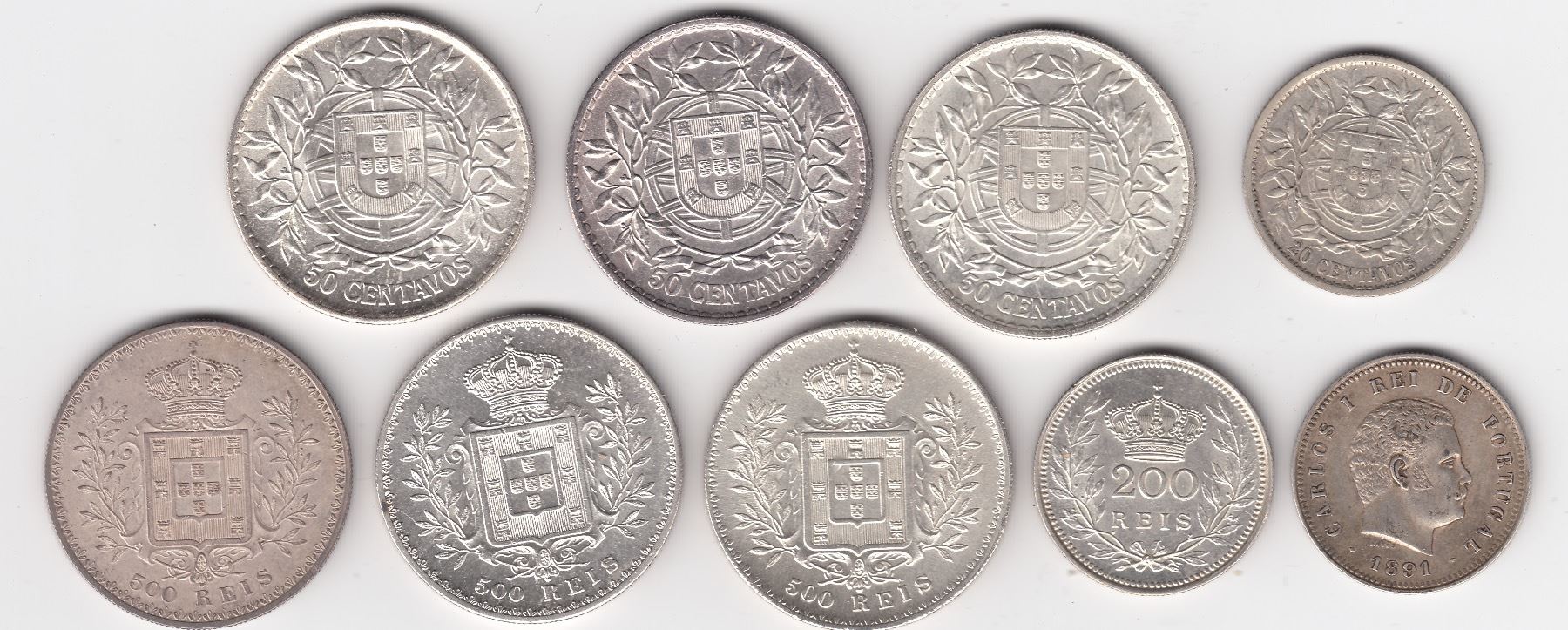 20 Centavos 1916; 50 Centavos: 1912, 1913, 1914; 200 Reis: 1891, 1909; 500 Reis: 1891, 1892, 1903. 9 Pcs.