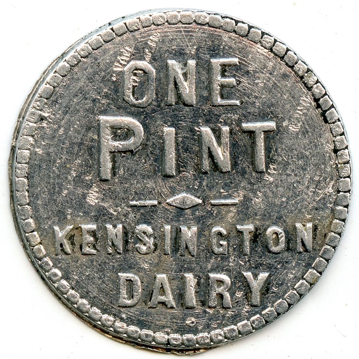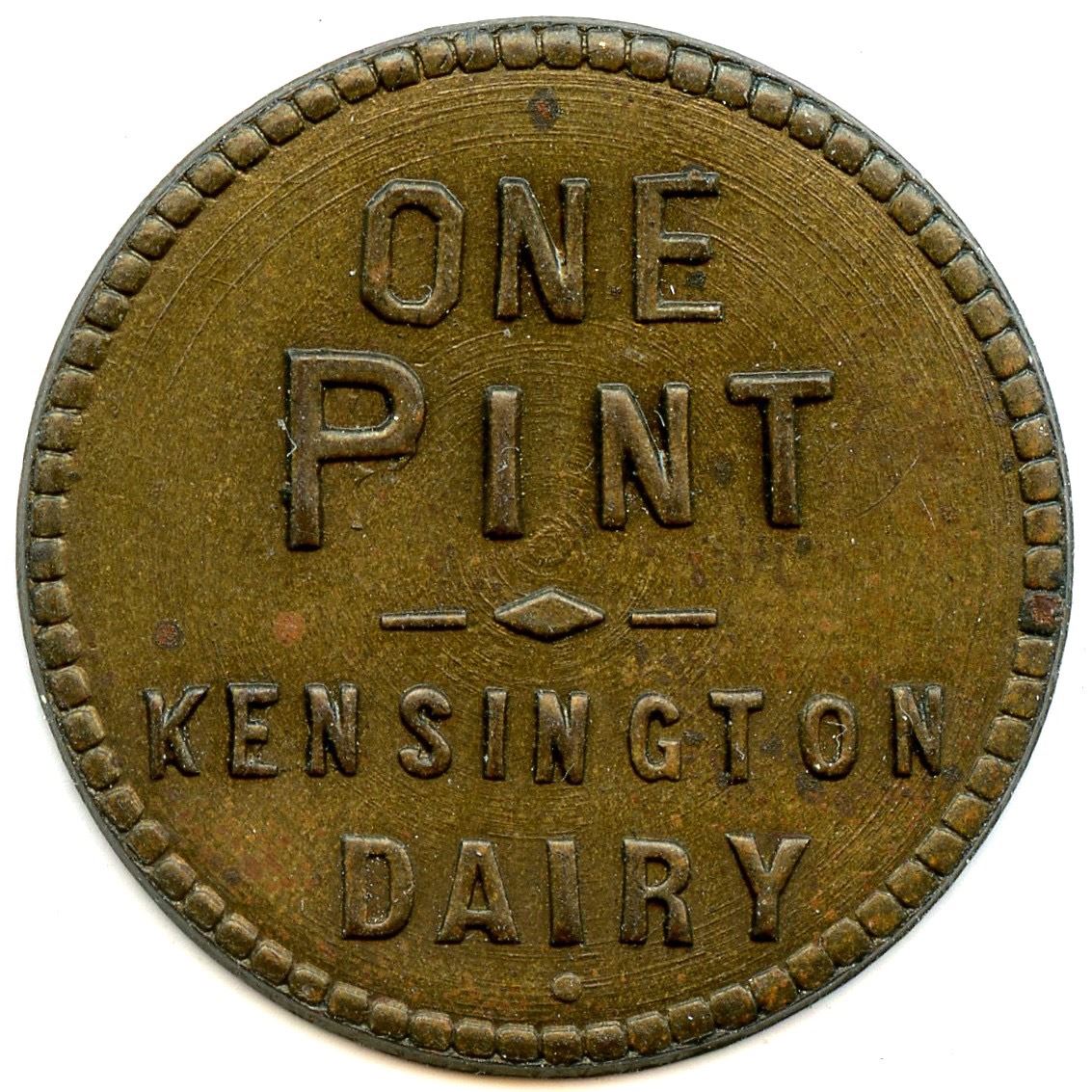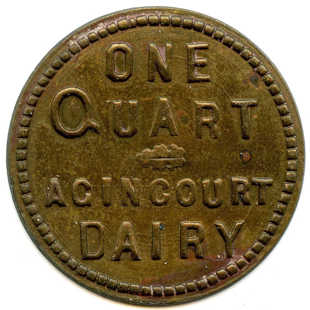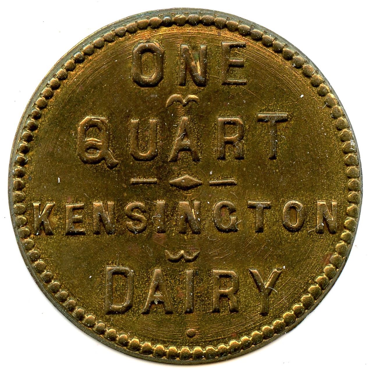 Breton 806, LeRoux 1064y, Kensington Dairy, One Quart, Toronto, Brass, 26mm, 3.72g, AU; Breton 807, LeRoux 1064z, Kensington Dairy, One Pint, Toronto, Aluminum, 23mm, 0.87g, EF; Breton 807, LeRoux 1064z, Kensington Dairy, One Pint, Toronto, Brass, 23mm, 2.98g, EF; Breton 814, LeRoux 1060a, Agincourt Dairy, One Quart, Toronto, Brass, 26mm, 3.25g, AU. 4pcs.