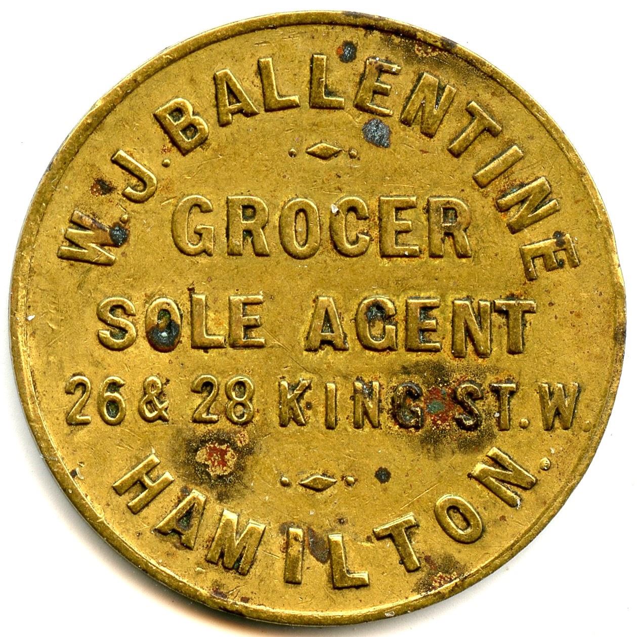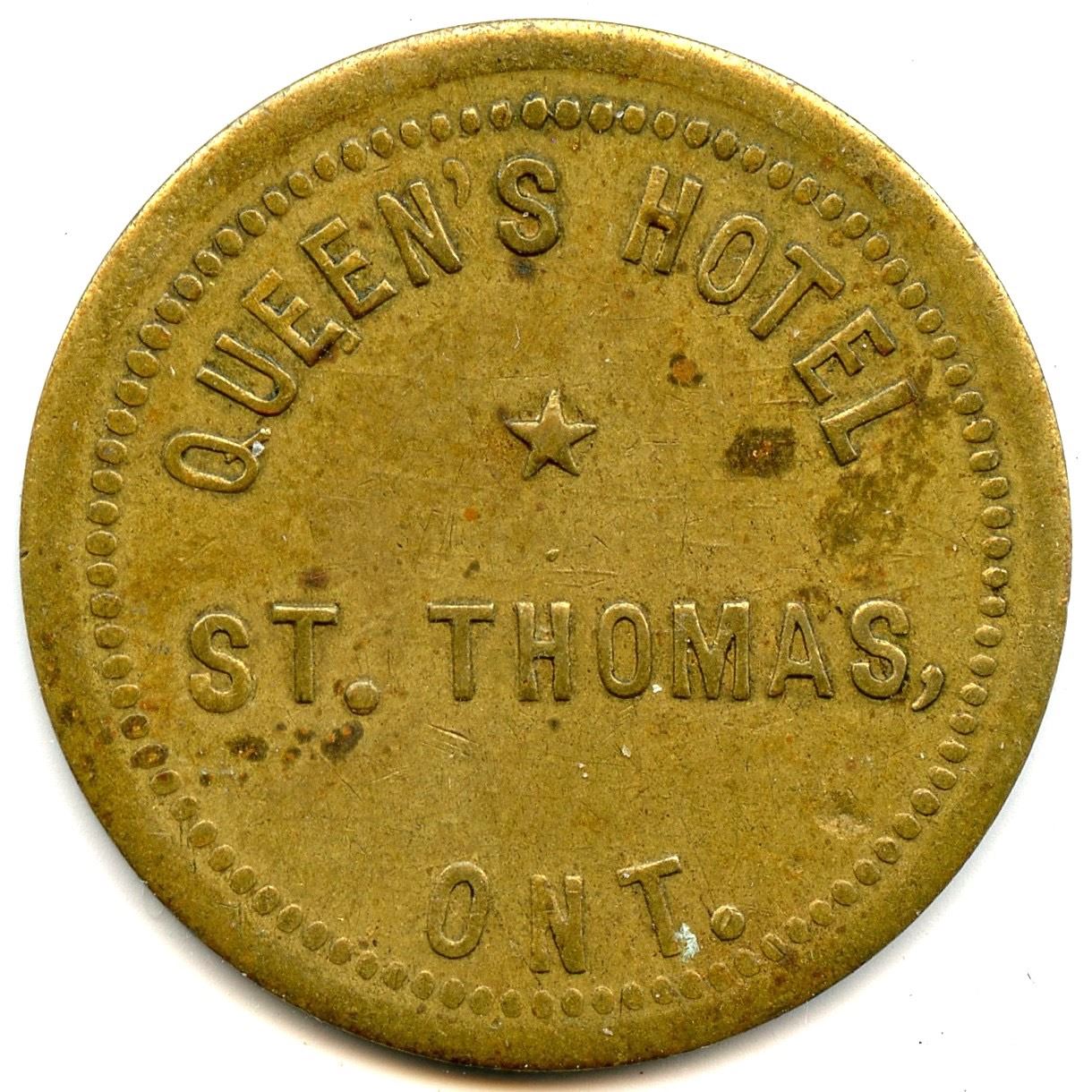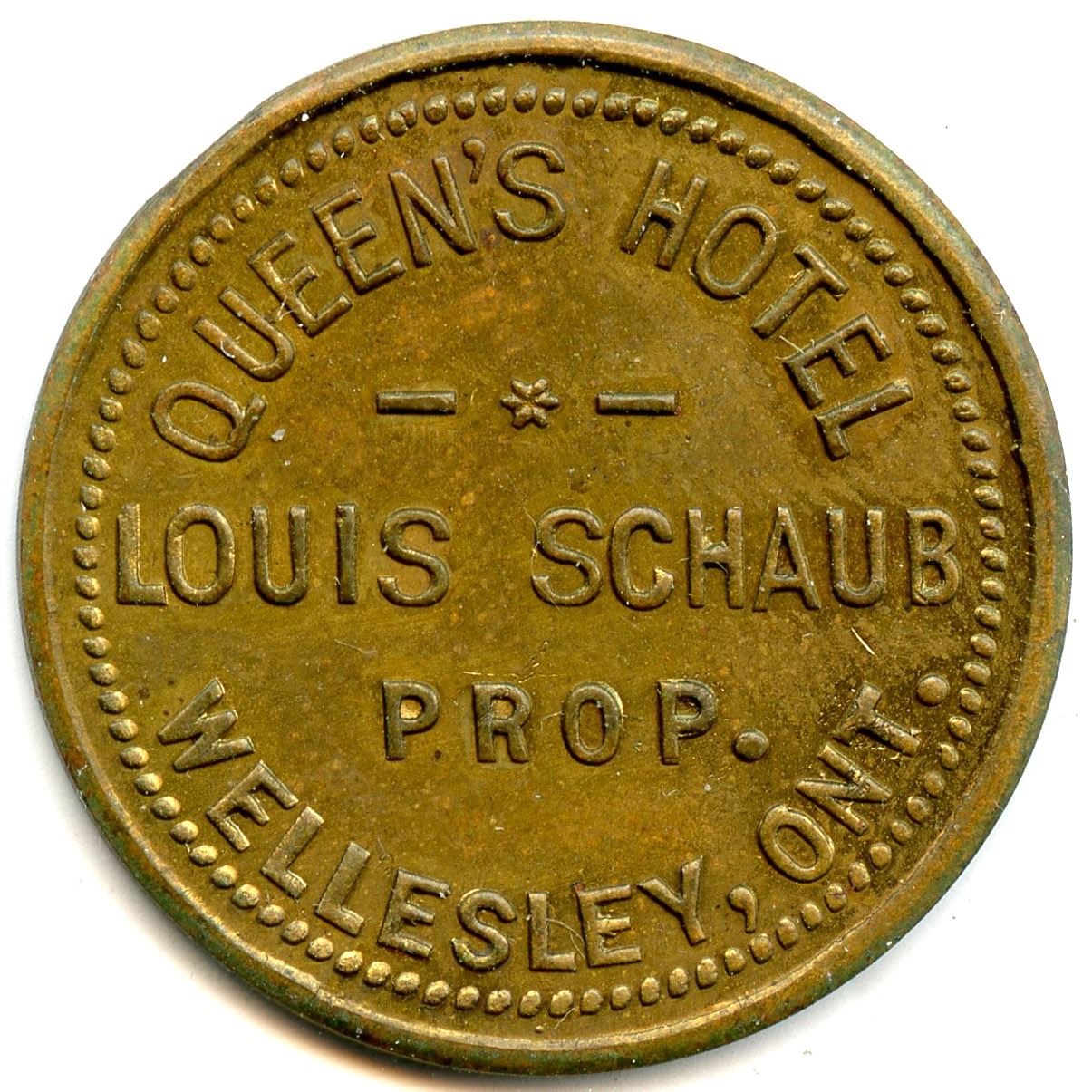 Breton 850½, LeRoux 1072p, Queen's Hotel, Louis Schaub, 5 Cents, Wellesley, Brass, 25mm, 5.32g, AU; Breton 851, LeRoux 1074n, Queen's Hotel St. Thomas, Brass, 25mm, 4.10g, EF; Breton 852, LeRoux 1067g, W.J. Ballentine, Hamilton, Brass, 26mm, 5.58g, EF; Breton 855, LeRoux 1069q, W.C. Edwards, 1 Cord, Ottawa, Brass, 25mm, 3.94g, EF. 4pcs.