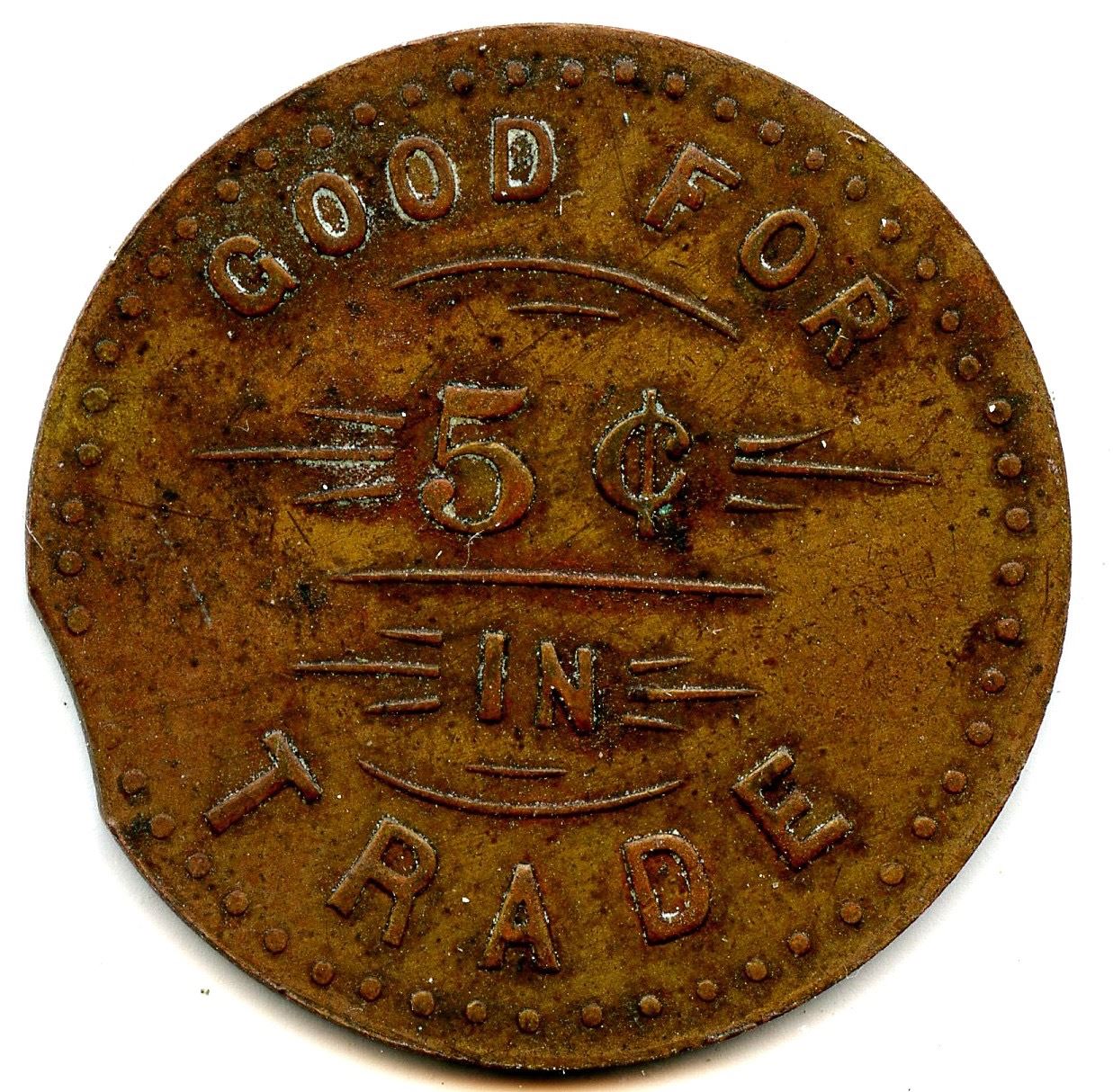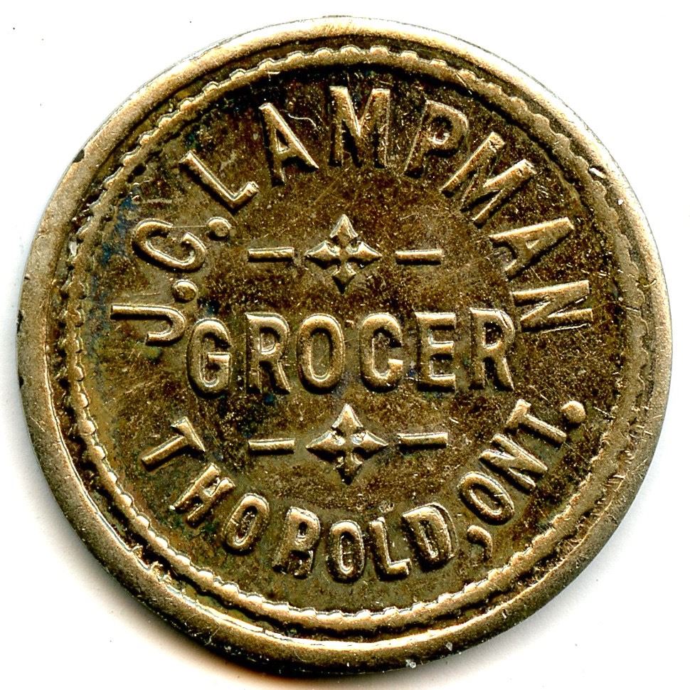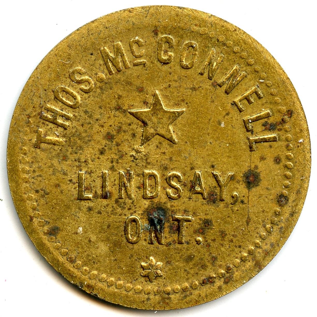 Breton 753, LeRoux 1025, A.D. Fancher, 5c, Peterborough, Brass, 25mm, 4.11g, EF; Breton 756, LeRoux 1032, J.C. Lampman, 5, Thorold, German Silver, 20mm, 2.81g, UNC; Breton 760, LeRoux 1039, H. Paulas, 5, Fort Erie, Brass, 20mm, 2.90g, AU; Breton 764, LeRoux 1058, Thos. McConnell, 5 Cents, Lindsay, 25mm, 3.92g, EF; Breton 768, LeRoux 1059, MacLarens Mills, 1, 16 Cross Bars on the 1, Copper, 28mm, 3.78g, EF. 5pcs.
