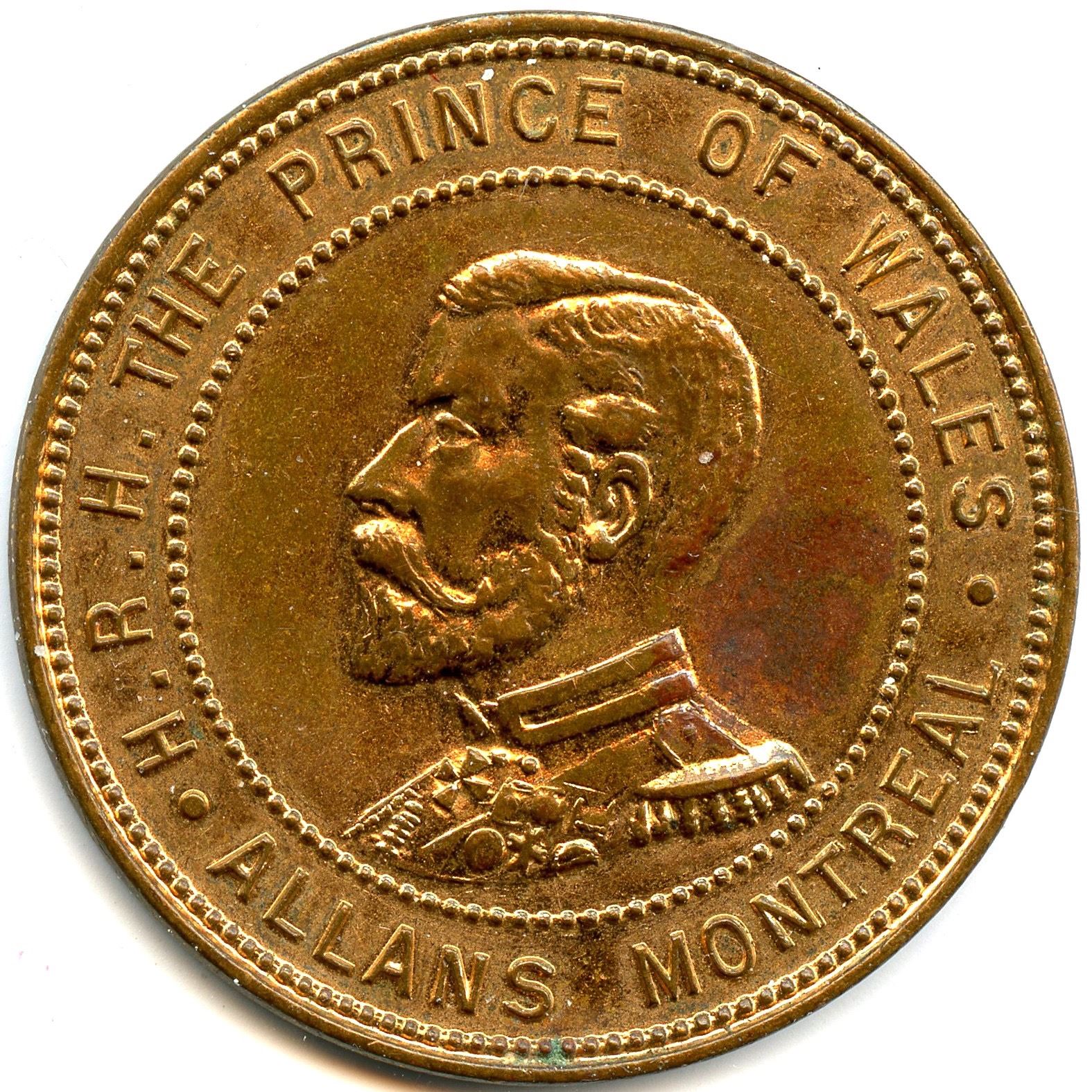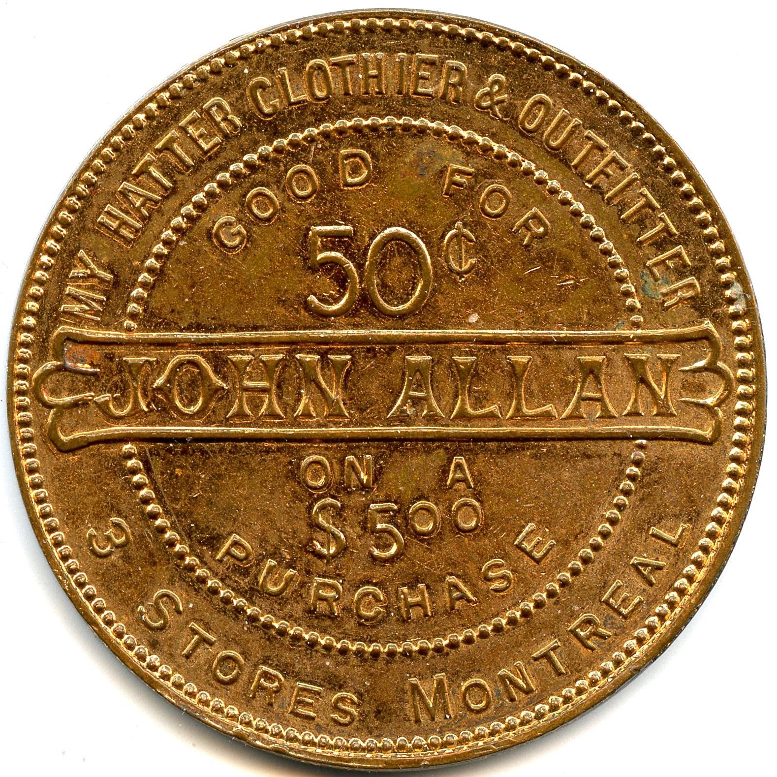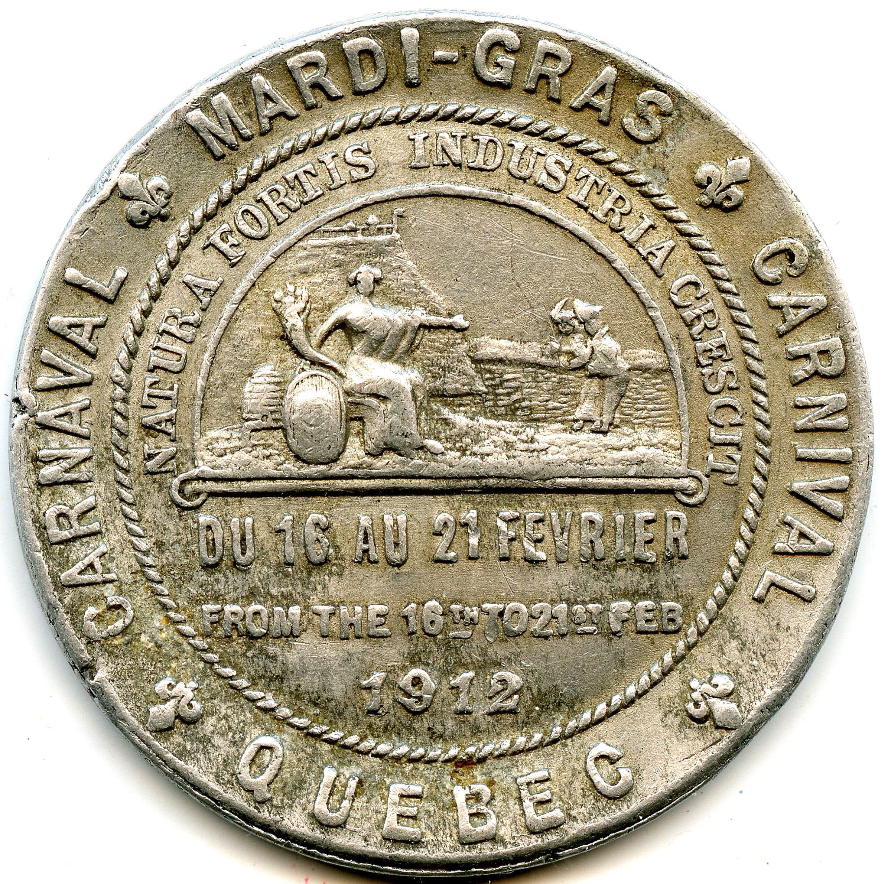 Bowman 2900a, John Allan, 50c on a $5 Purchase, Gilt, 33mm, 11.32g, AU; Bowman 3807a, 1912 Mardi-Gras Quebec, Aluminum, 43mm, 9.20g, F. 2pcs.