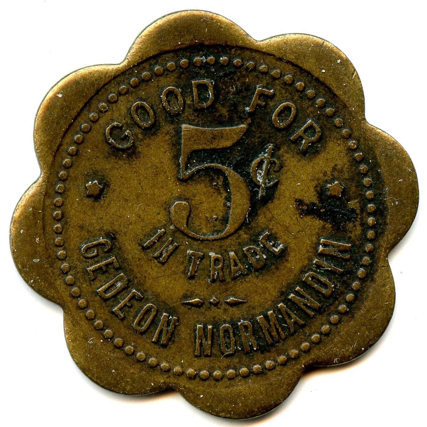 Breton 624, LeRoux 1047, 200 issued, Brass,F(rancois) S(ylvestre), 5 Cents, Montreal, 24mm, 4.18g, EF; Breton 627, LeRoux 1054, 100 issued, Brass, G(edeon) N(ormandin), 5 Cents, Montreal, 25mm, 3.87g, EF; Breton 627E, Gedeon Normandin, 5 Cents, Montreal, Brass, Scalloped 8, 29mm, 5.34g, EF. 3pcs.