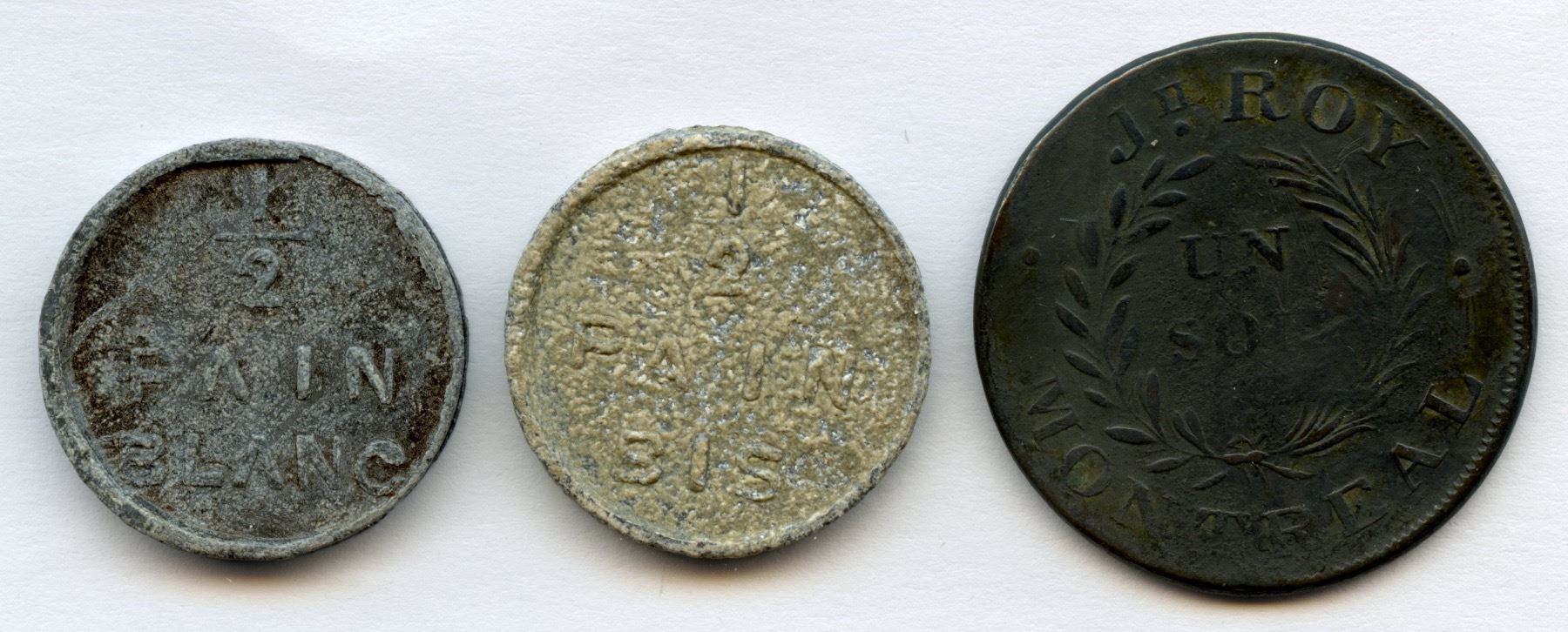Br 668. W. H. Childs' Token, Quebec. ½ Pain Blanc. (1000 issued) W. H. Childs is noted in the 1890 Quebec directory as being located at 190 St. Valier; he's listed at 340 St. Valier in 1896, but it is likely the same premises and due to changes in the numbering of the streets. Breton states that the tokens were never used. Lead. EF. Br. 669, W. H. Childs' Token, Quebec. ½ Pain Bis. Lead, VF. Br 671. Joseph Roy Halfpenny. Thin Flan. CH LC-20A2. 6.32 grams. Fine. 3 pcs.