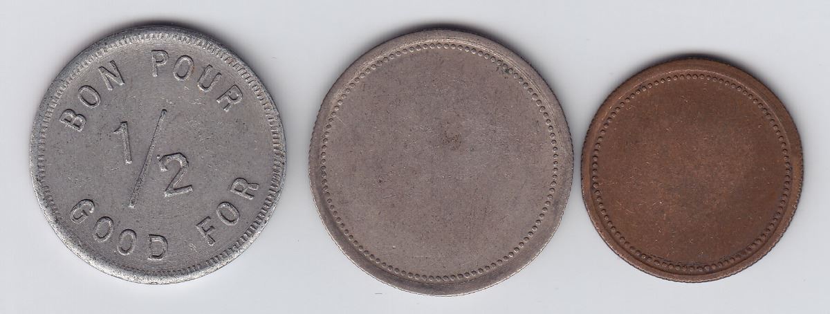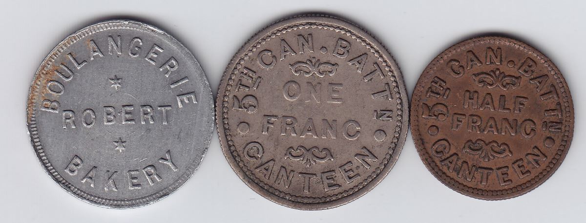 5th Canadian Battalion canteen 1/2 franc and 1 franc specimens; Boulangerie Robert Bakery, Quebec bread token. 3 Pcs.