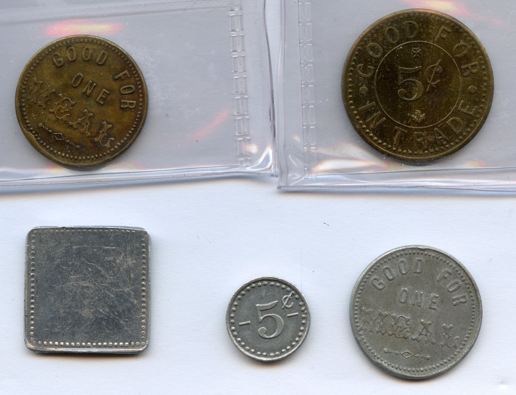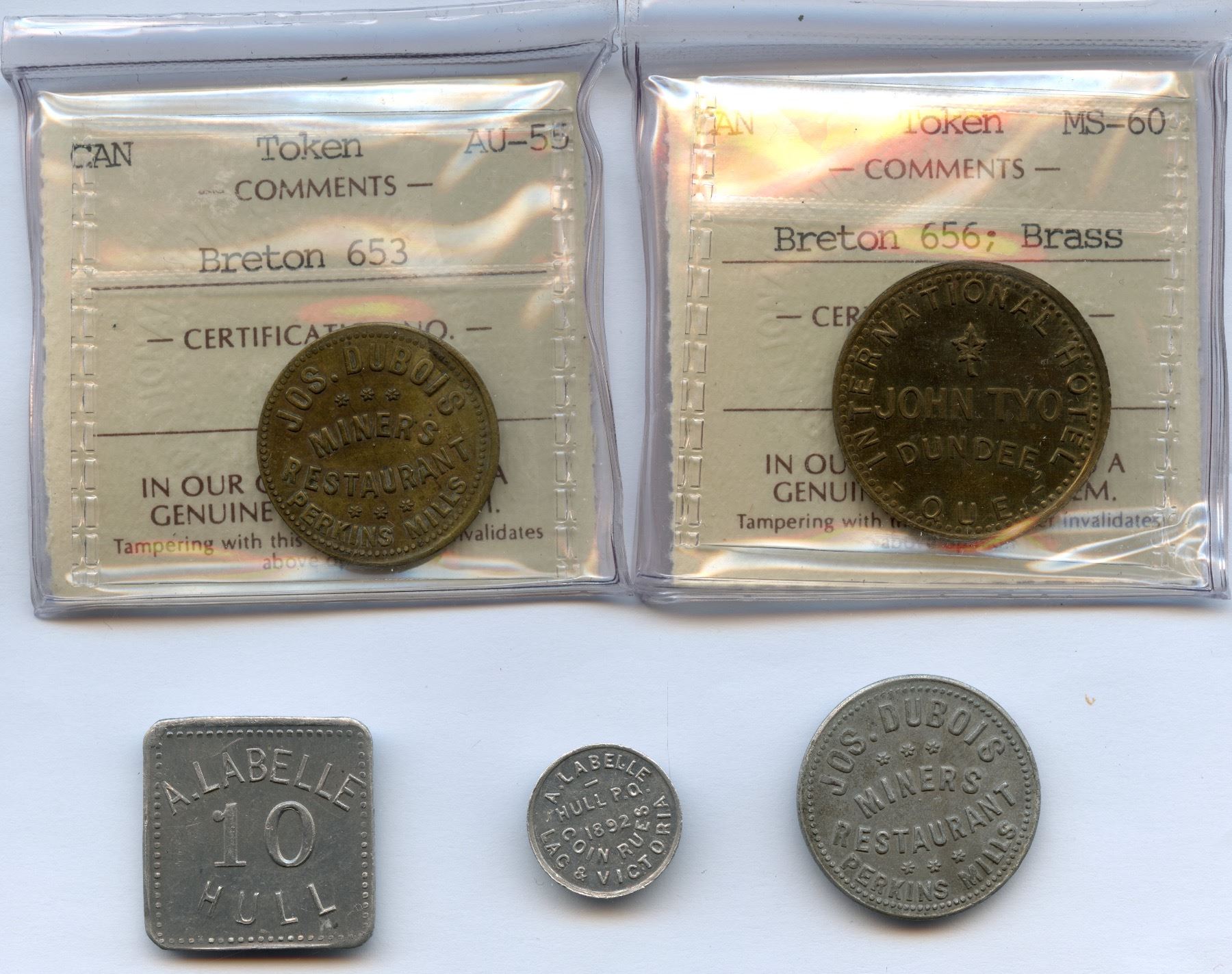 Includes: Br 652 & 652a. Br Jos. Dubois, Miners Restaurant, AL. Br 653 Jos. Dubois, Miners Restaurant, brass, ICCS AU-55. Br 656; Brass - John Tyo Dundee International Hotel, ICCS MS-60. 5 pcs.