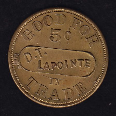 Post Confederation Tokens. D.T. Lapointe, Ottawa, ON, 5 cents, McColl 1219A, brass, AU.