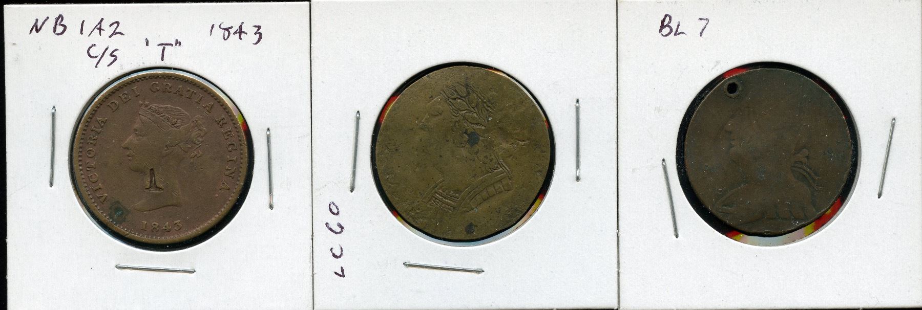 Lot of 3 colonial age coppers, including an 1843 NB half penny counter stamped with a "T" (NB-1A2); Bust and Harp (LC-60); Blacksmith token (BL-7) good fine with a small hole.