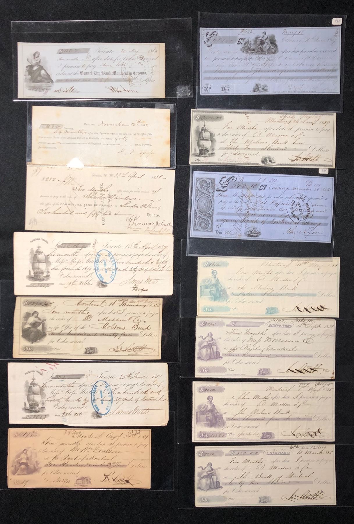 Pre-Confederation Promissory Notes, 1842-1864. Many are illustrated with at least one vignette. Often these notes were discounted by chartered banks, whose rubber stamped or embossed impressions they sometimes bear - City Bank, Molsons Bank, Commercial Bank of Canada, Bank of Montreal. There are at least two interesting and historic signatures on these documents: John Ostell (Montreal architect) and Thomas Galt. Fourteen notes, Ex: Walter Allan.