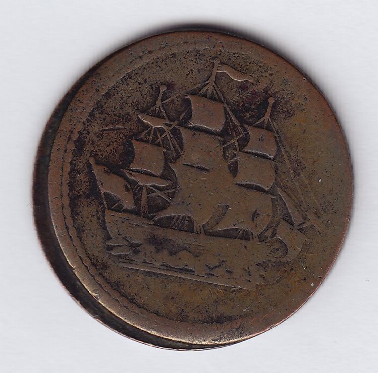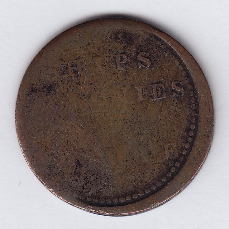 Prince Edward Island, Lees 3 CH PE10-3A1 and CH BL-24A1. This scarce token is included in both the PEI series of Ships, Colonies and Commerce tokens and the Blacksmith series. It weighs 7.3 gms and a diameter of 29.9 mm. It is on a thick planchet and has the medal alignment.