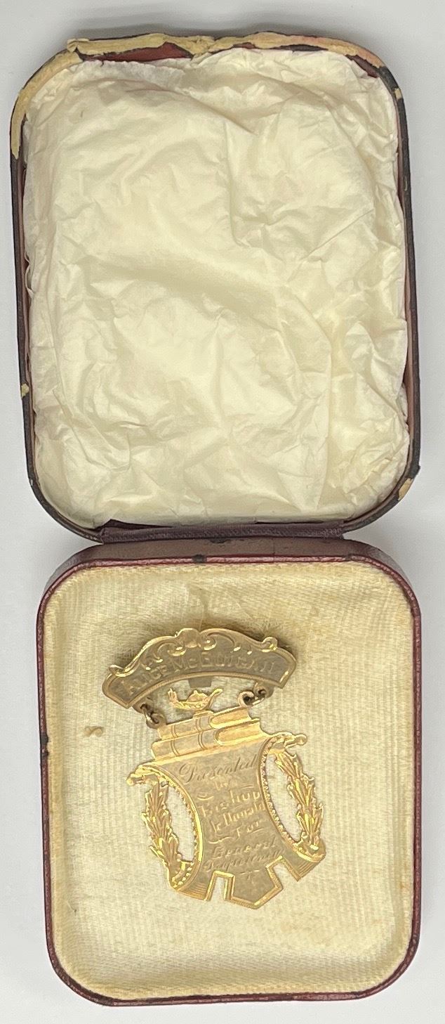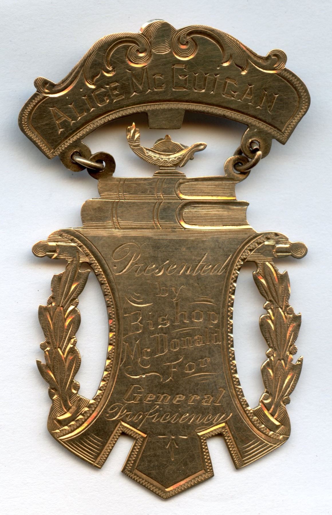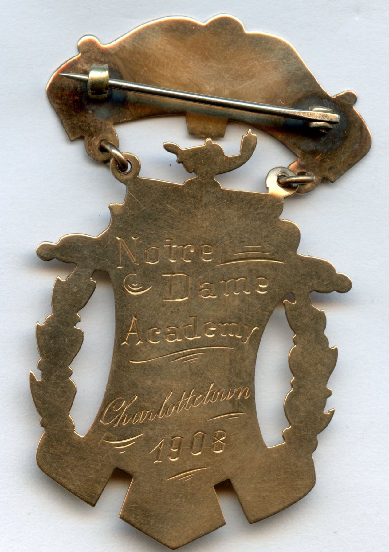 A gold medal of Notre Dame Academy, Charlottetown dated 1908. It was awarded to Alice McGuigan. It is 10k gold weighing 6 gms. Part of the Dickieson Collection.
