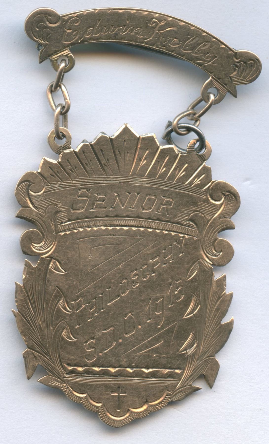 A gold medal of St. Dunstan's College for Senior Philosophy awarded to Edwin Kelley on June 1, 1915 by Rev. A.P. McLennan. It is 9k and weighs 6.7 gms. Part of the Dickieson Collection.