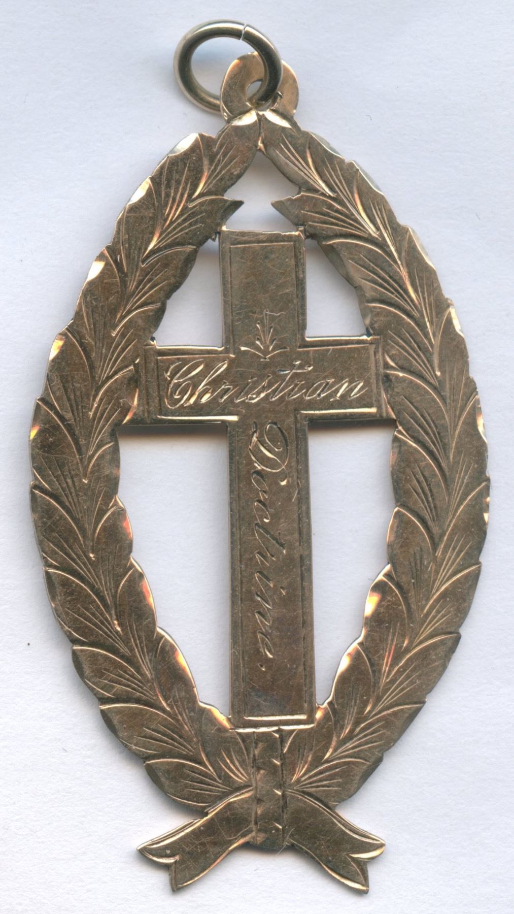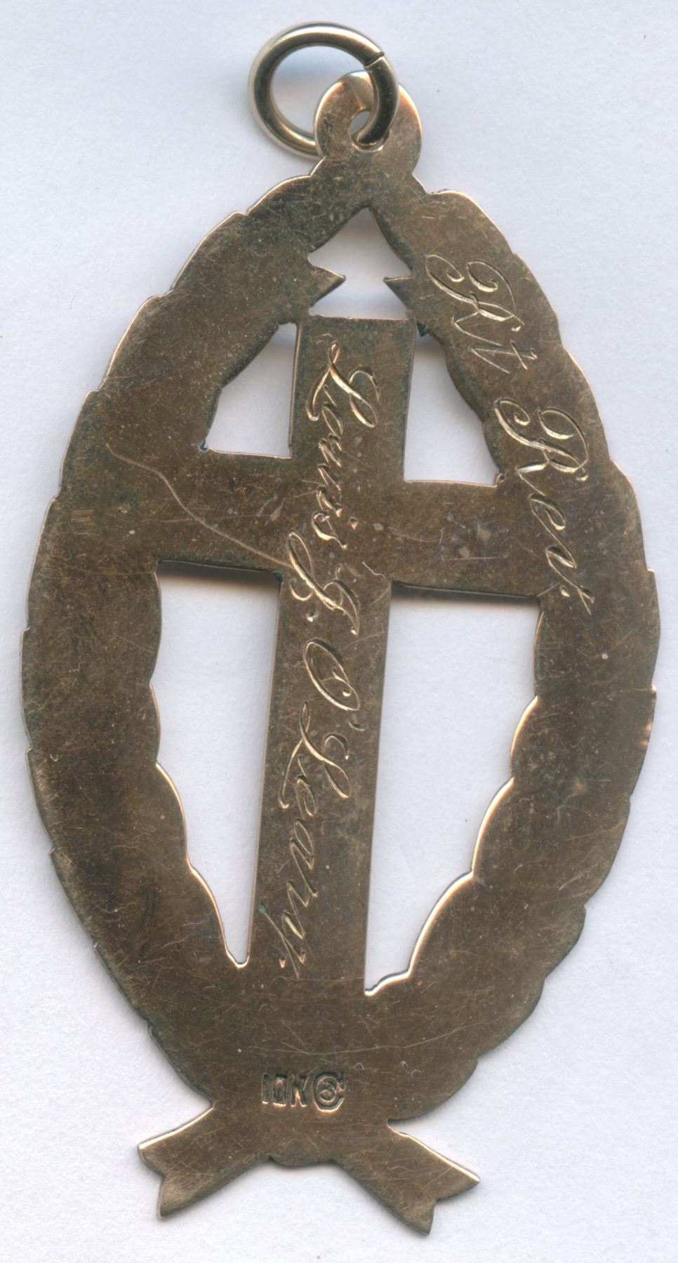 A gold medal of PEI awarded for Christian Doctrine by the Bishop of Charlottetown Rev. Louis J. O'Leary on July 19, 1922. It is 10k weighing 4.2 gms. Part of the Dickieson Collection.
