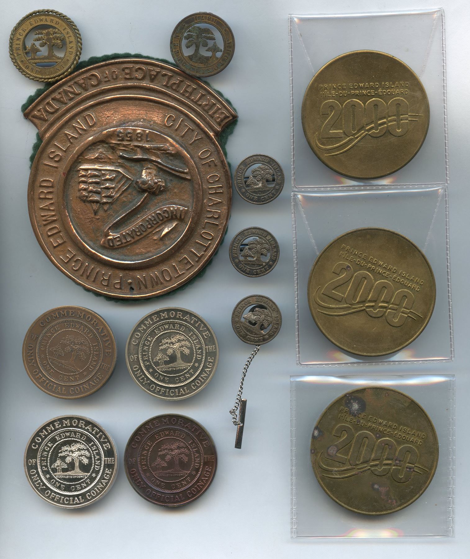 Includes: Set of Four 1971 commemorative medals to celebrate the 100th anniversary of the 1871 penny, PEI's only decimal coin. The set consists of silver, bronze, copper and nickel specimens. Also, a rather interesting gathering of odds and sods. A set of cuff links and tie tac, silver colored; 1871 cent lookalikes cut outs (x2); large City of Charlottetown copper paper weight; Year 2000 brass medals issued to 1900 students to commemorate spanning 2 centuries involvement in education (x3).