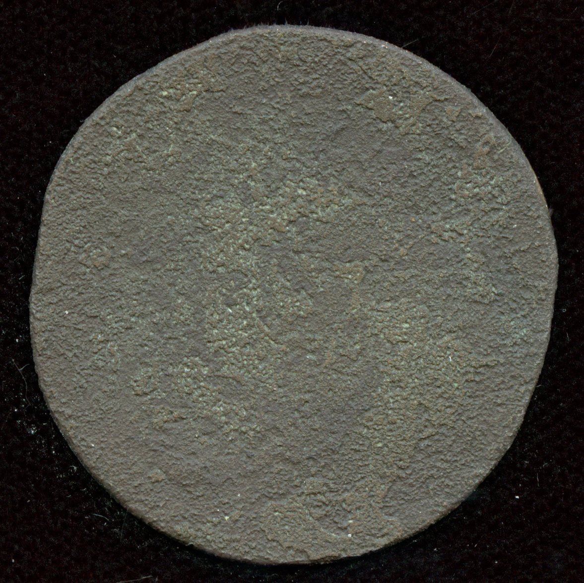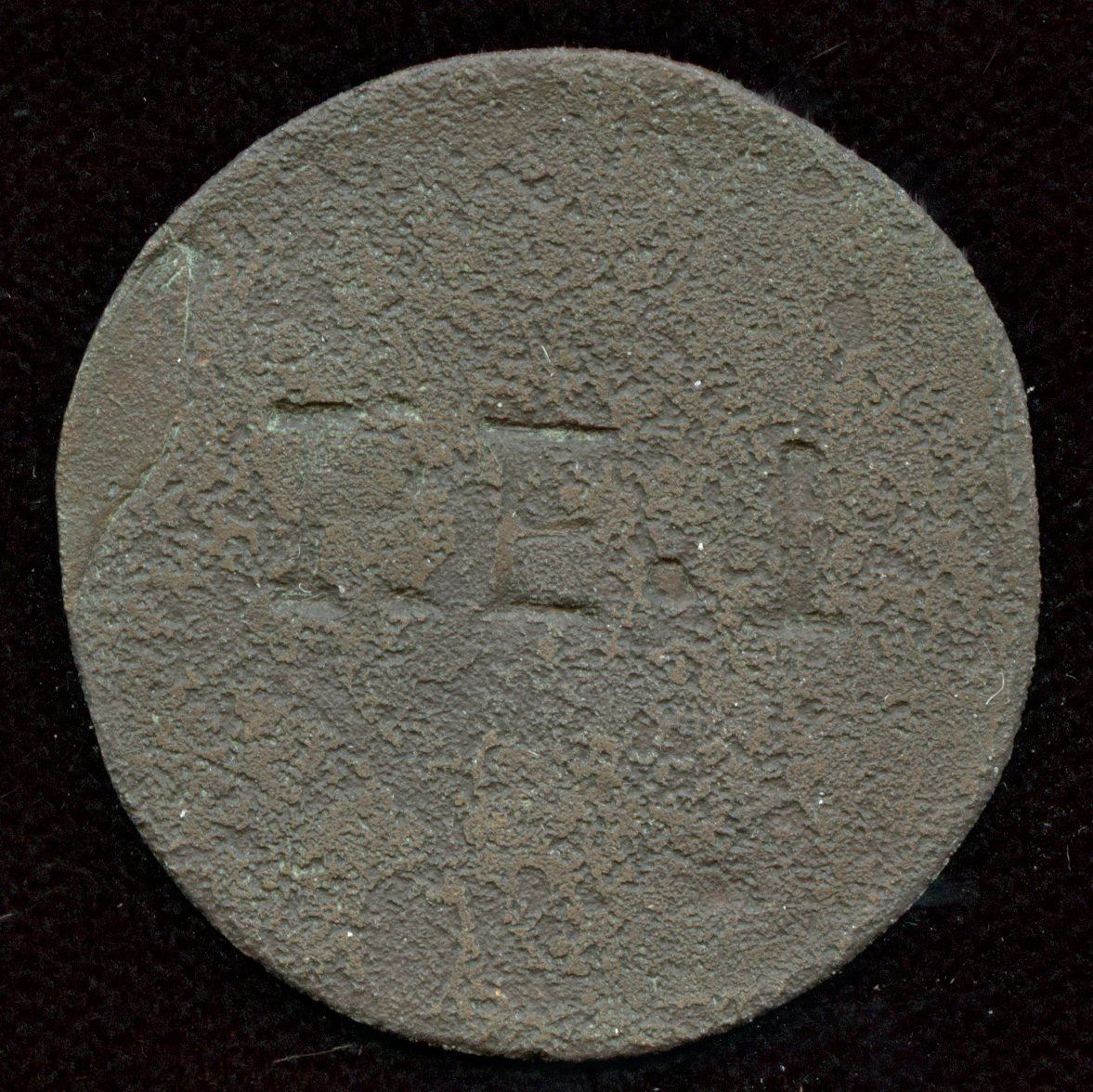 CH PE-2, the letters P.E.I. are incuse on an otherwise rough blank planchet, copper. It's likely date of production about 1840. This example is rough, with porous surfaces, perhaps from having been buried. The countermark is Fine for the issue and weighs 8.4gms.