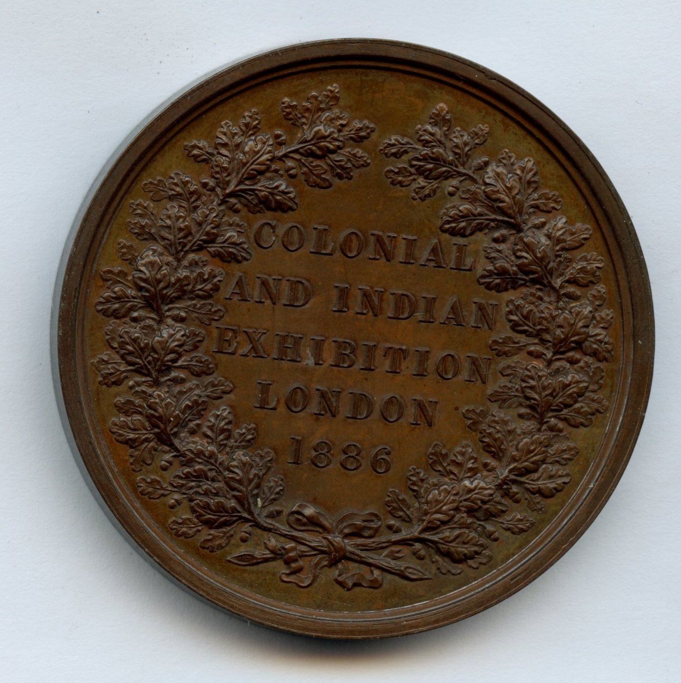 Bronze, 53mm, copper. Medal struck for the 1886 Colonial and Indian Exhibition held in South Kensington, London. Designed by Leonard Charles Wyon, the medal features a bust of Albert Edward, Prince of Wales (later King Edward VII) on the obverse and an oak wreath with the exhibition's name and date on the reverse.