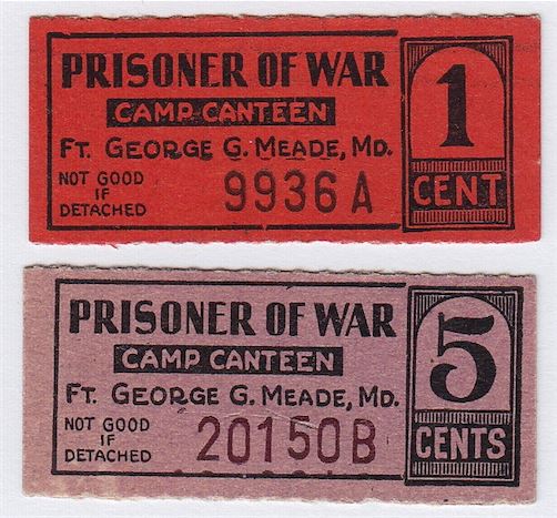 Prisoner of War Money - Fort George G. Meade (Maryland) - CH LC-8075a, 1 cent, orange with black print; CH LC-8077a, 5 cents, violet with black print. 2 Pcs.