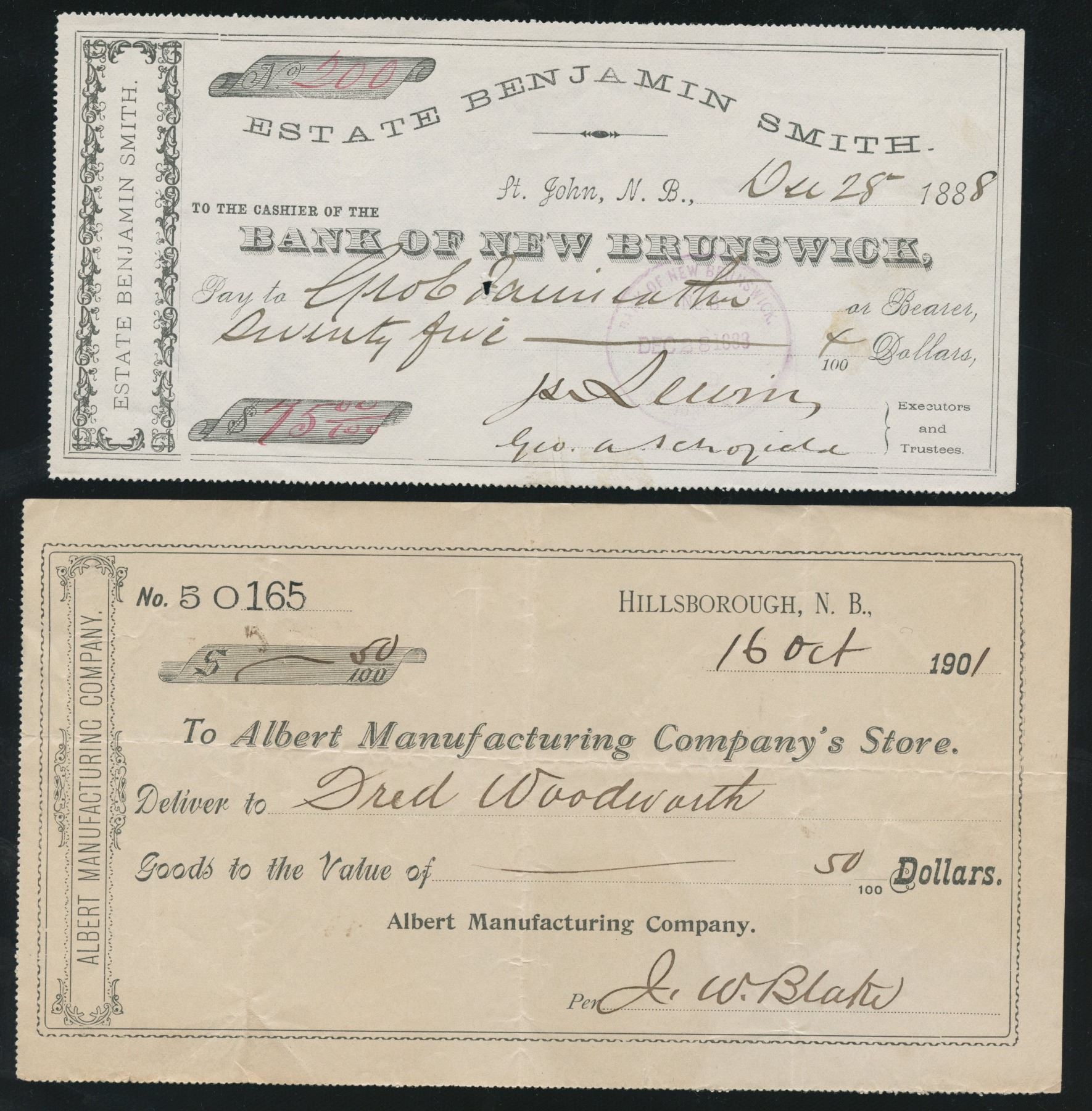 Estate of Benjamin Smith, drawn on the Bank of New Brunswick, 1888 & Albert Manufacturing Company Store, Hillsborough, NB. 2 pcs.