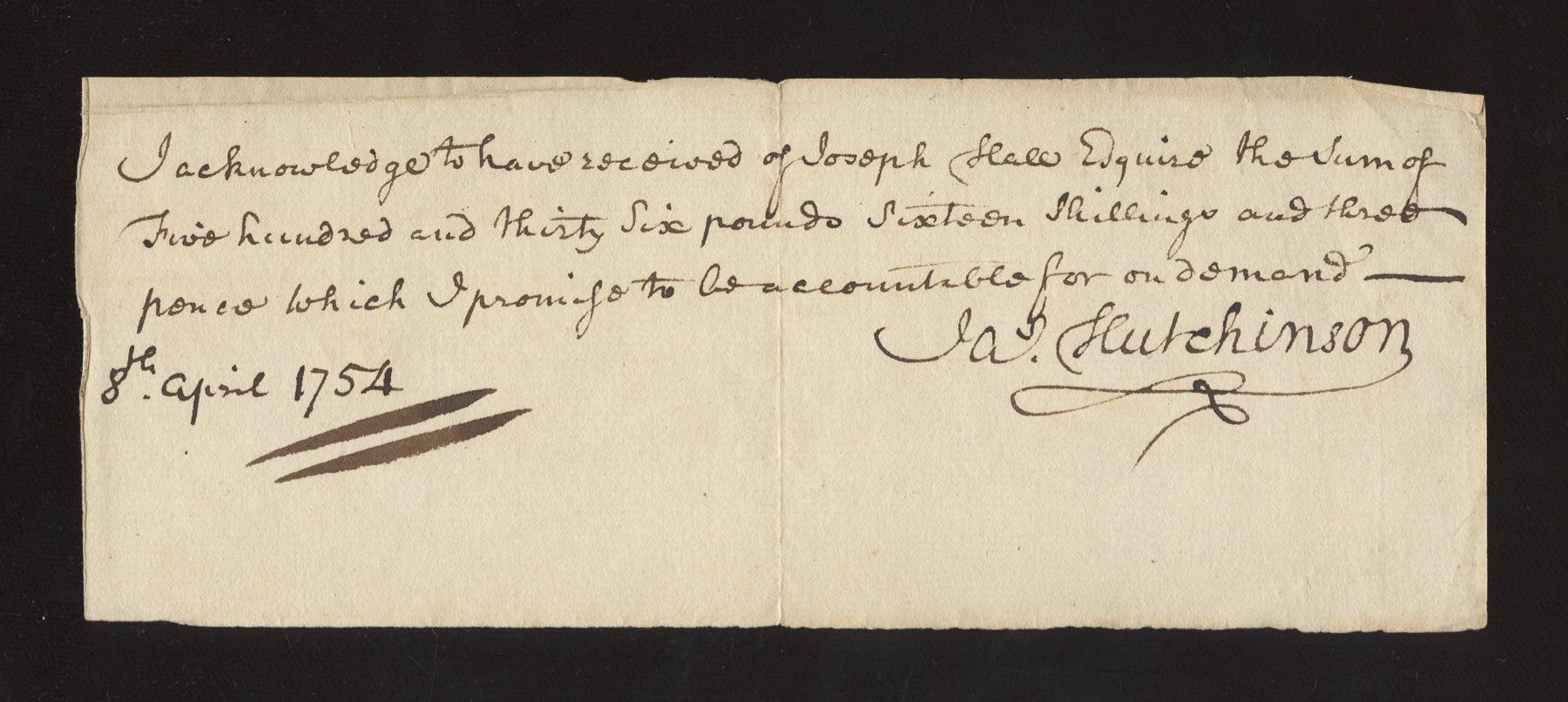 Issued from J.A Hutchinson to Joseph Hall for the sum of Two Hundred and Thirty Six Pounds Sisteen Shillings and three pence for which he promises to be accountable for on demand.