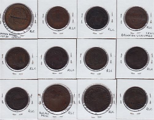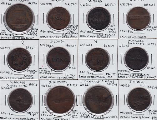 W.H. MARTAIN on obv. & rev. of Bank of Montreal penny, 1842, Br 526 (M.I. 642, Brunk M-232); G. KING on rev. of Bank of Montreal ½ penny, 1842, Br 527 (M.I. 559, Brunk K-201); W. MEAD on rev. of Bank of Montreal ½ penny, 1842, Br 527 (M.I. 647, cf. Brunk M-559); W. KRAPP on obv. of Bank of Montreal ½ penny, 1844, Br 527 (M.I. 564, Brunk K-333); L R counterpunched on rev. of Bank of Montreal ½ penny, 1844, Br 527 (M.I. 572); B. LONG on Bank of Montreal ½ penny, 1844, Br 527 (cf. Brunk L-462); M on obv. of Bank of Montreal ½ penny, 1844, Br 527 (M.I. 603); MONTREAL in script on rev. of Bank of Montreal ½ penny, 1844, Br 527 (M.I. 659); H. MORSE and a crude star on obv. of Bank of Montreal ½ penny, 184__, Br 527 (M.I. 665). D B McRAE on obv. & rev. of Quebec Bank penny, 1852, Br 528 (M.I. 633, Brunk M-544); L. MANHARD twice on obv. and once on rev. as well as F. KANE scratched on rev. of Quebec Bank penny, 1852, Br 528 (M.I. 637, Brunk M-140); J. MANLY. (with perforations in the form of a cross) on obv. of Quebec Bank ½ penny, 1852, Br 529 (M.I. 638, Brunk M-142). 12 Pcs.