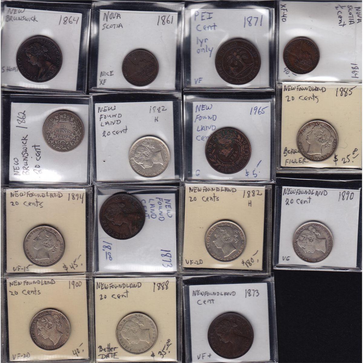 Provincial Decimal Lot - Includes: Nova Scotia 1861 & 1864 half cent. New Brunswick 1864 One Cent, 1862 Twenty Cent. Newfoundland - 1865, 1873 (2) One Cent, 1882H (2), 1885, 1888, 1890, 1894, 1900 Twenty & Twenty Five Cents. Prince Edward Island 1871 One Cent. We recommend viewing this lot, conditions vary, no return. 15 Pcs.