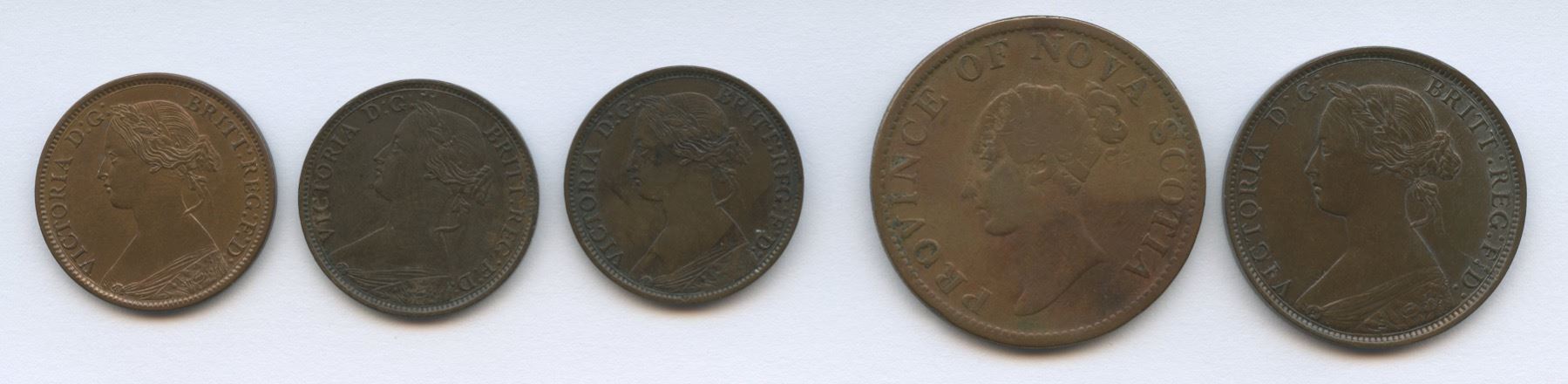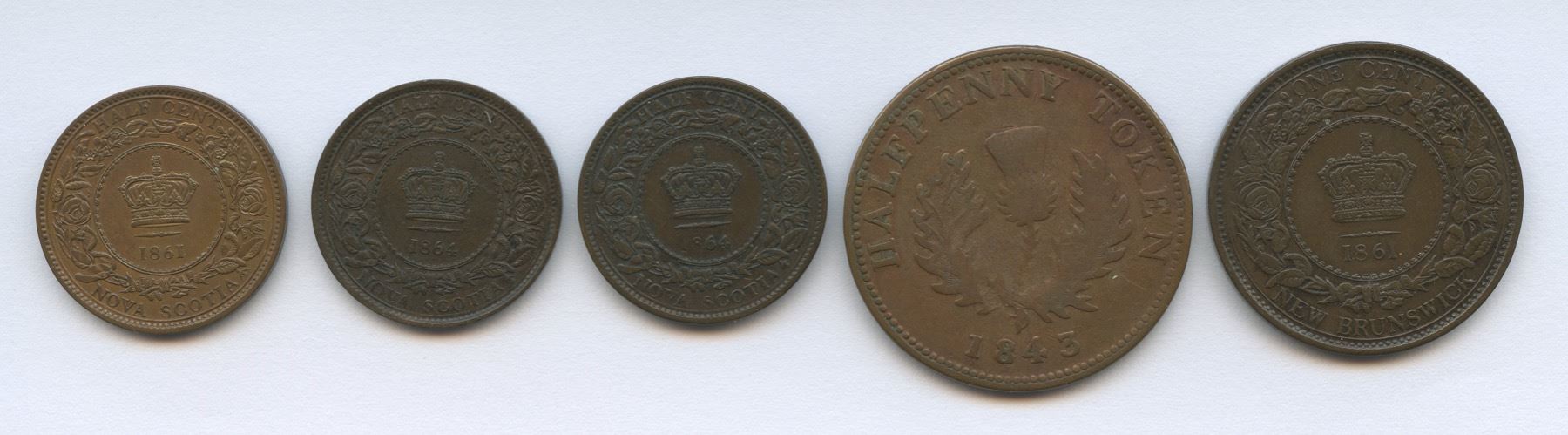 Includes: 1861 NS Half Cent, EF/AU (lightly cleaned). 1864 Half Half Cent, VF & AU with rotated dies. 1861 NB One Cent, small rose bud, AU (lightly cleaned). 1843 Half Penny Token, NS1F1, Br #874. 5 pcs.