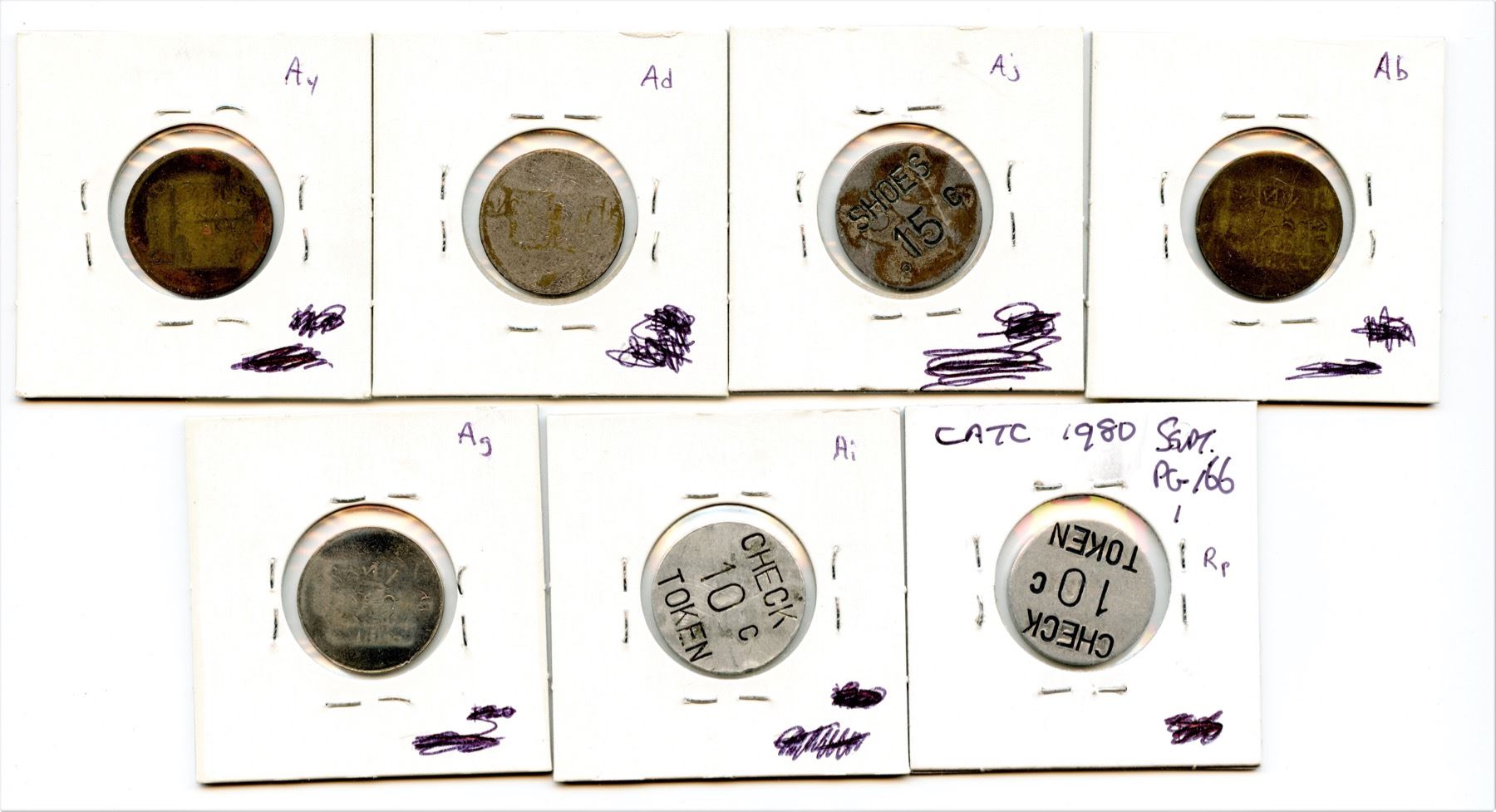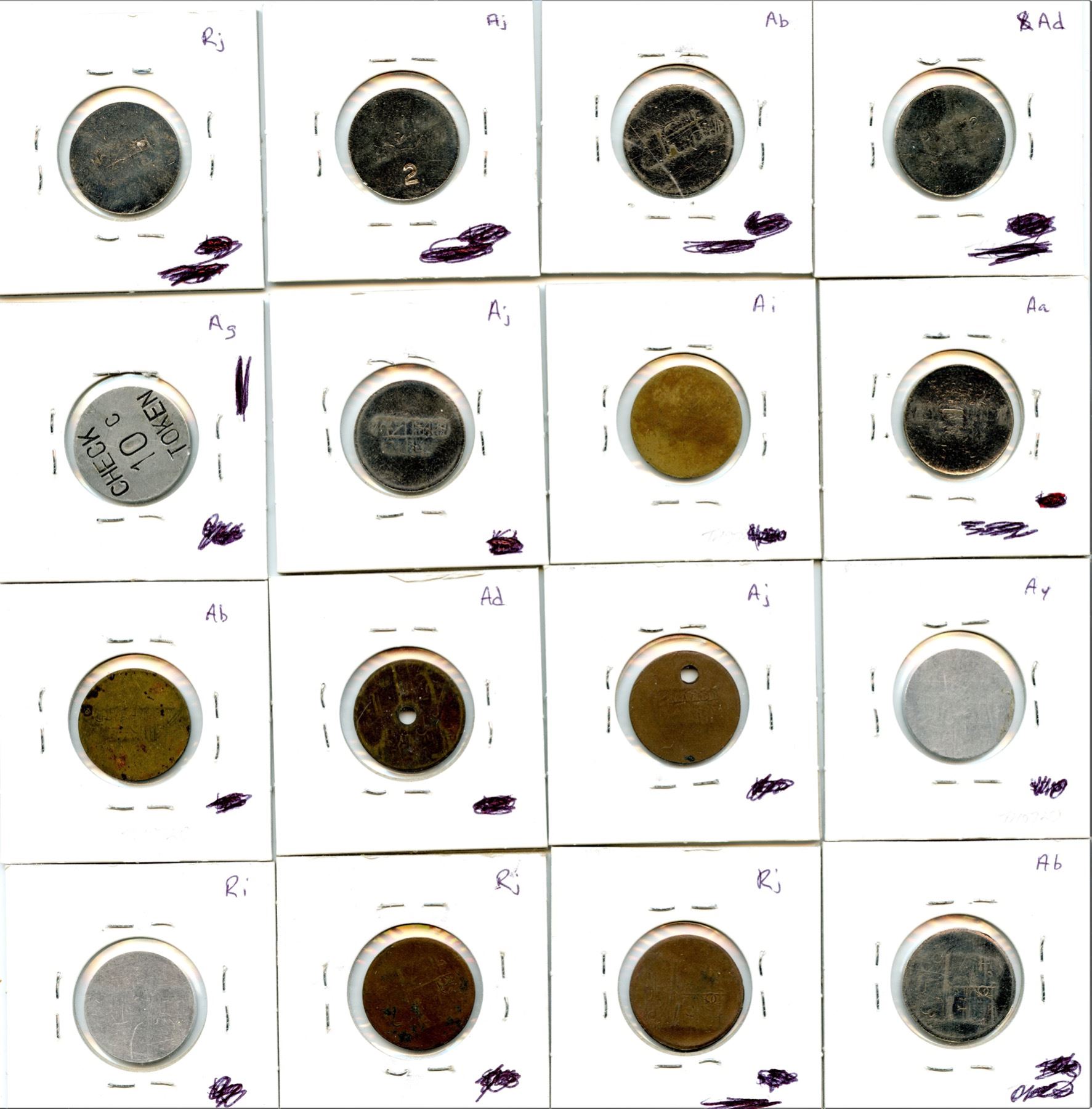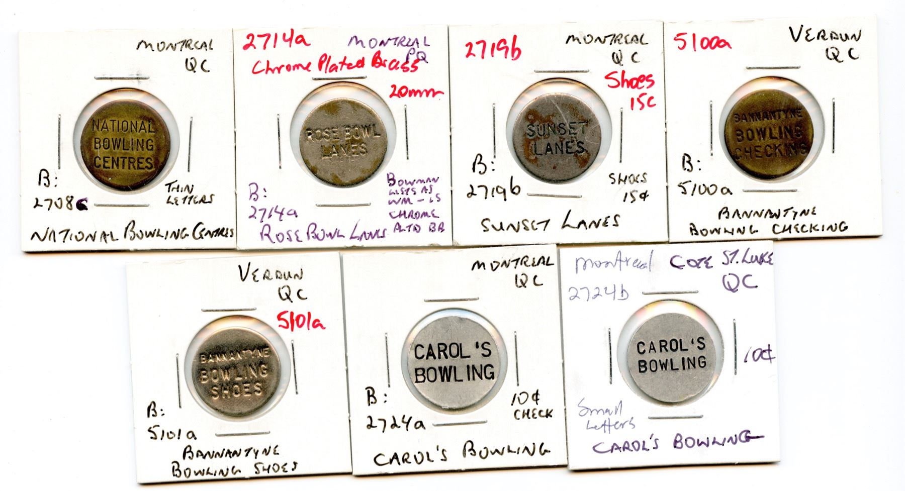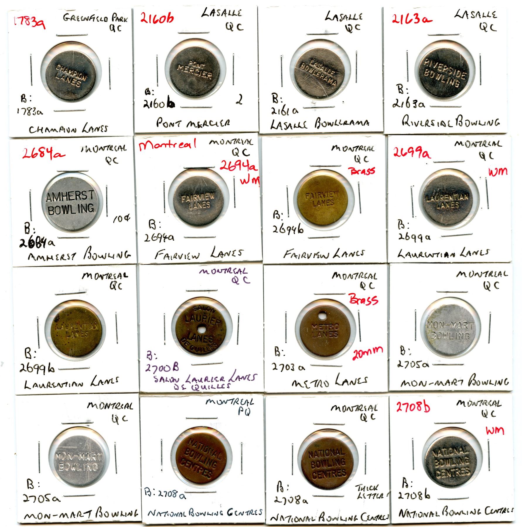 QUEBEC INCUSE TOKENS. Lot of 23 Bowling Tokens. Greenfield Park, 1783a, WM; LaSalle, 2160b, WM; 2161a, WM; 2163a, WM; Montreal: 2684a, alum.; 2694a, WM; 2694b, brass; 2699a, WM; 2699b, copper; 2700b, brass; 2703a, brass; 2705a, alum.; 2705a, alum.; 2708a, copper; 2708a, copper; 2708b, WM; Same as 2708a, but letters are narrow, not listed, 20mm, copper; 2714a, listed as WM but is chrome plated brass; 2724a, alum., large letters; 2724b, alum., small letters; 2919b, Shoes 15c, listed as WM but is chrome plated brass; Verdun: 5100a, copper. 23 Pcs.