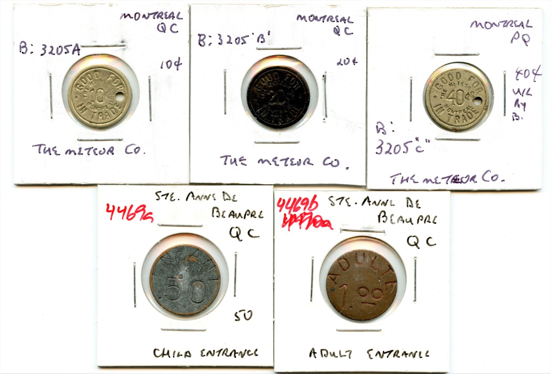 QUEBEC INCUSE TOKENS. Lot of 5 tokens. Montreal,3205a, The Meteor Co., 10c, WM, holed on right, VF, Reverse: 104, also listed in Amusement Tokens of the United States and Canada, by Alpert & Smith; Same as previous, but 20c and blank reverse, copper, 18mm, VF; Same as 3205a, but 40c, Reverse: 103, WM, 18mm, VF; Ste-Anne-de-Beaupre, 4469a, Enfant / 50, bifacial, copper, Fine; 4469b, Adulte / 1.00, copper, EF. 5 Pcs.
