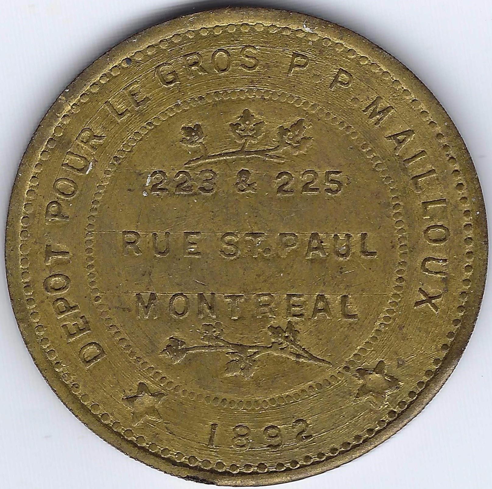 Issued by L. Gravel of Montreal in 1892, brass, 111 made, AU, 33 mm, 10.7g.
