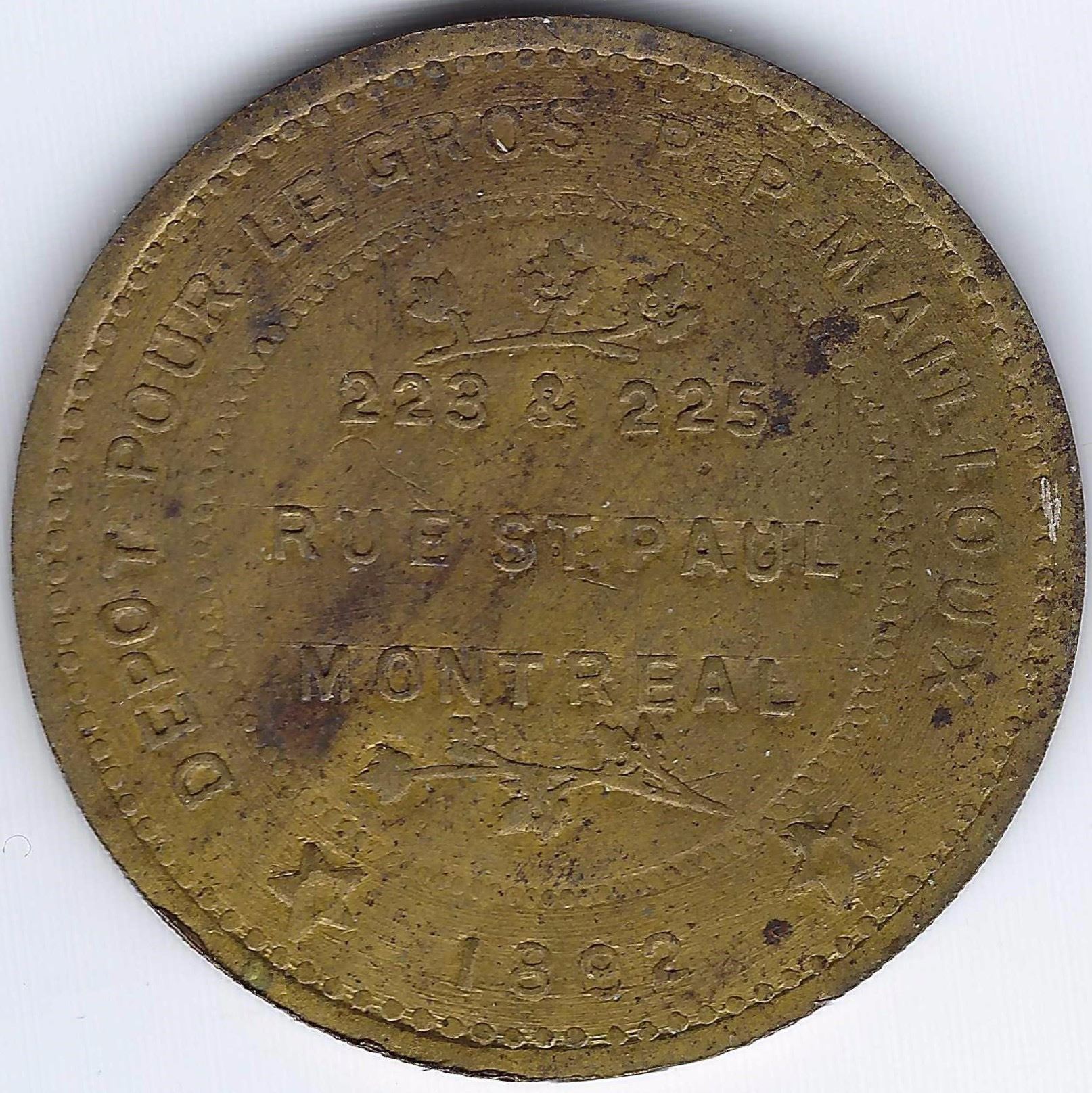Issued by L. Gravel of Montreal in 1892, brass, 111 made, AU, 33 mm, 10.9g.