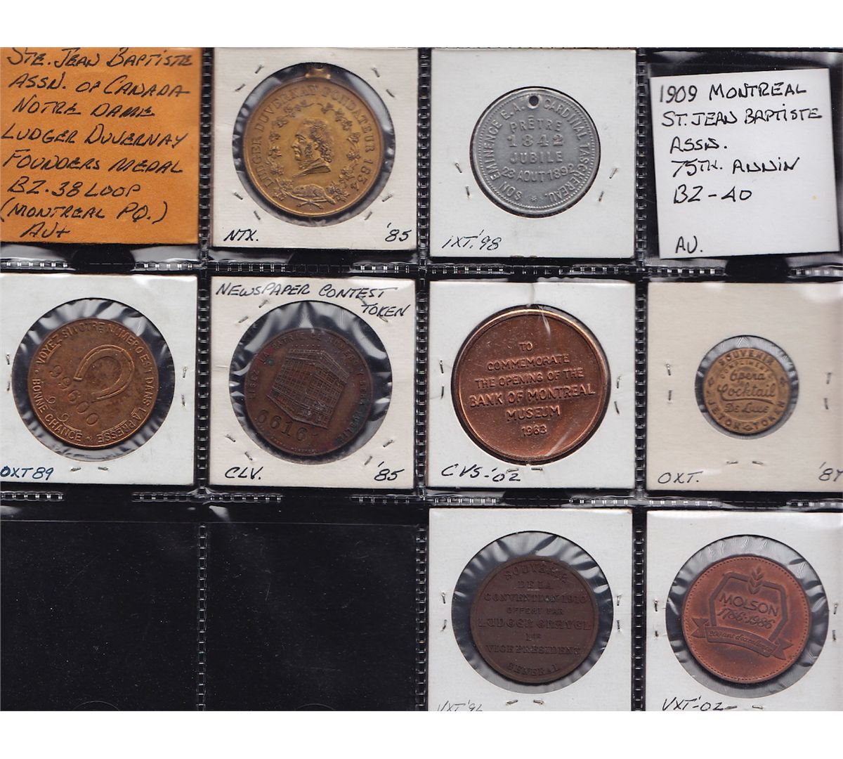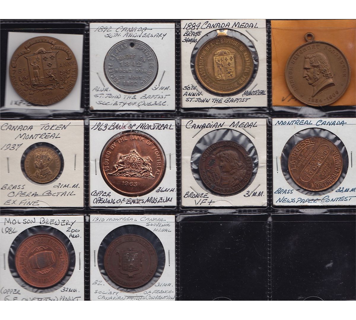 Quebec Medallions. Montreal Opera Cocktail, 1963 Bank of Montreal, Joanne D'Arc, newspaper contest, La Presse, Montreal, Molson Brewery, 1910 Soc. of Artisans, Montreal, 4 Jean Baptiste medals. Lot should be inspected before bidding. 10 Pcs.