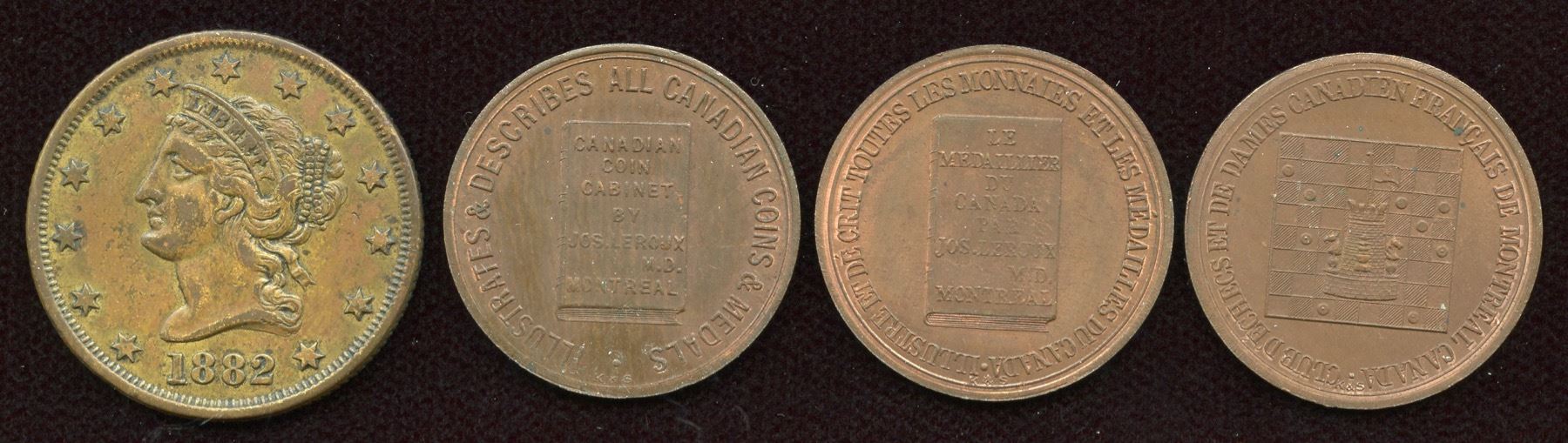 Br. 585, Leroux, Copper, Unc; Br. 586, Leroux, Copper, Unc; Br. 587, Checker Club, Copper, Unc; Br. 901, Blakely, Brass, EF. 4 pcs.