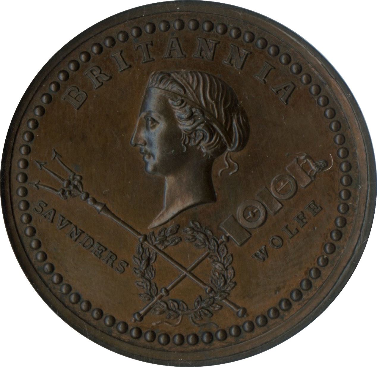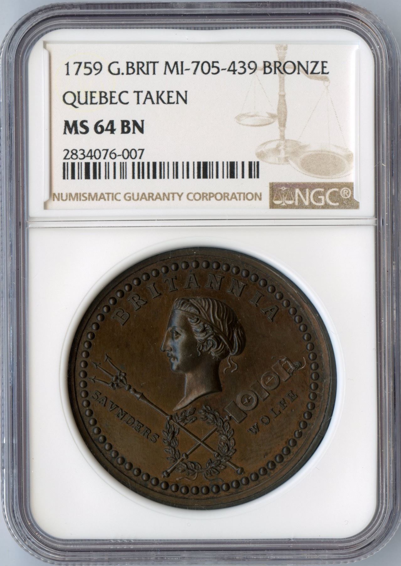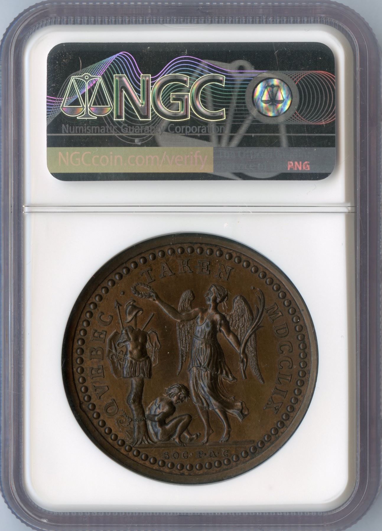 NGC MS64 Brown, MI-II-705/439, McLachlan-125, Betts-421, Breton-51, Eimer-673. 40mm. 28g. Plain edge. Unsigned (by John Pingo). As with the Montreal Taken and Canada Subdued medals, the engraver employed the popular Judea Capta motif with a defrocked French soldier bound to the stump of a tree with Victory right. This bronze example is a Gem. Glowing copper-orange colour surrounds the devices on each side with an overlay of violet and blue patina over the exposed fields. Spectacular quality and worth a premium bid.