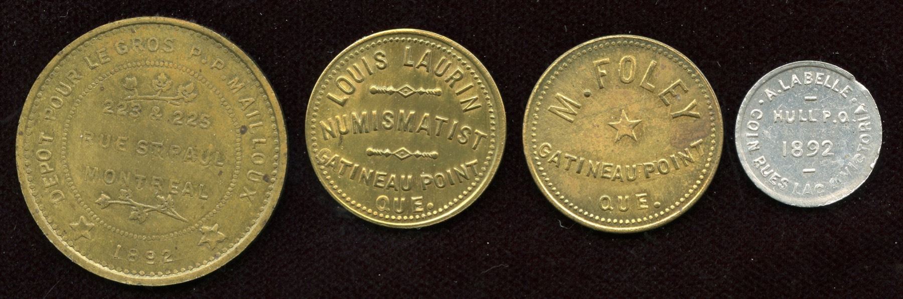 Br. 630, Louis Laurin, brass, UNC; Br. 631, M. Foley, brass, UNC; Br. 642, Balmoral, brass, VF; Br. 652a, A. Labelle, 10, UNC. 4 Pcs.