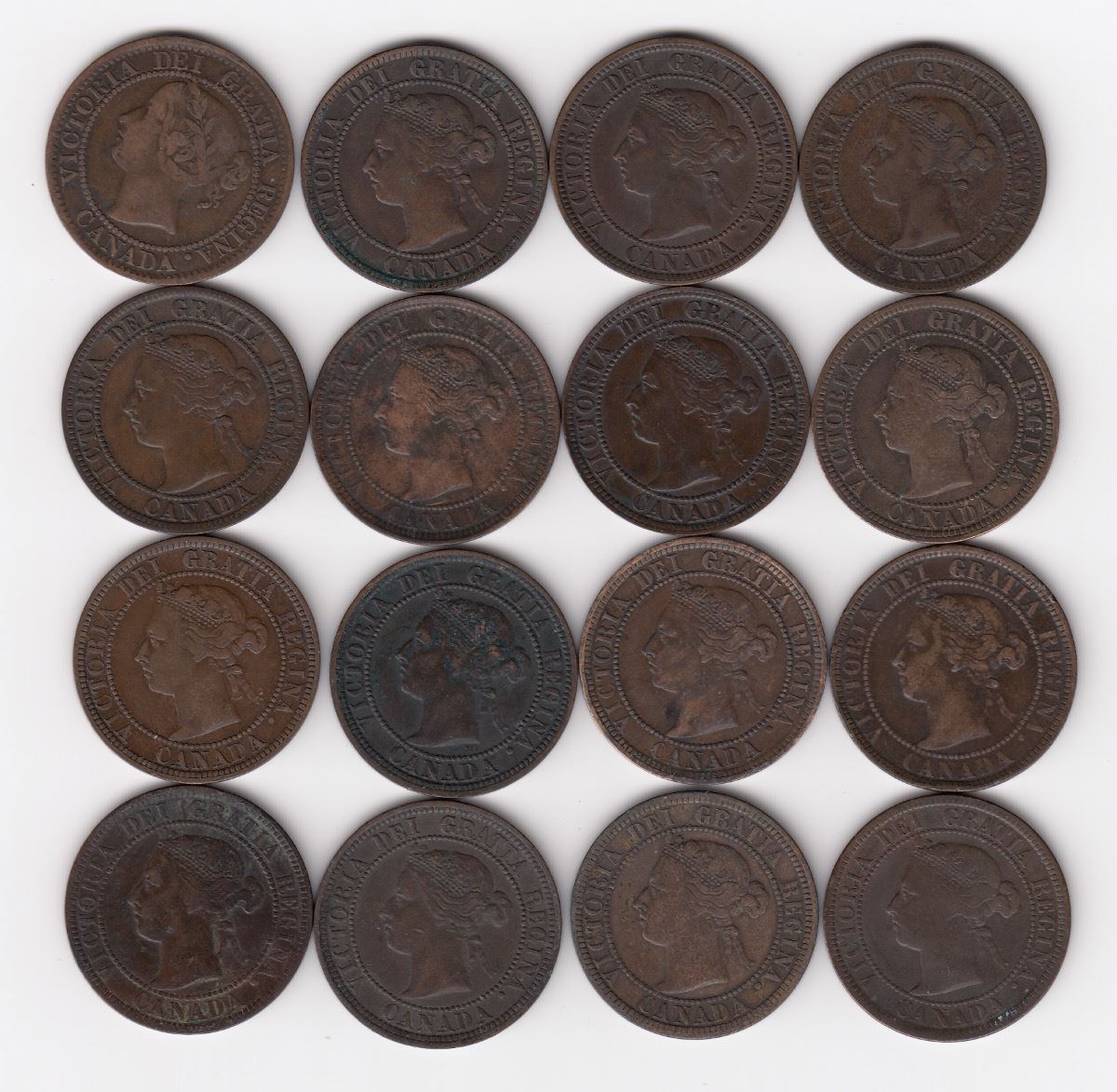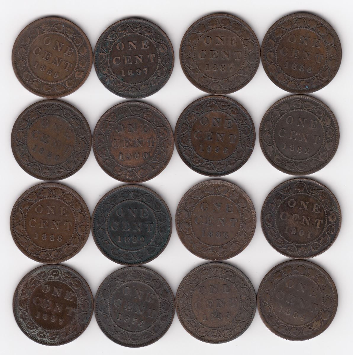 Queen Victoria One Cent Coins - Lot of 16 - All decent, catalogue value approx. $105. Inspection is advised, no return. 16 Pcs.