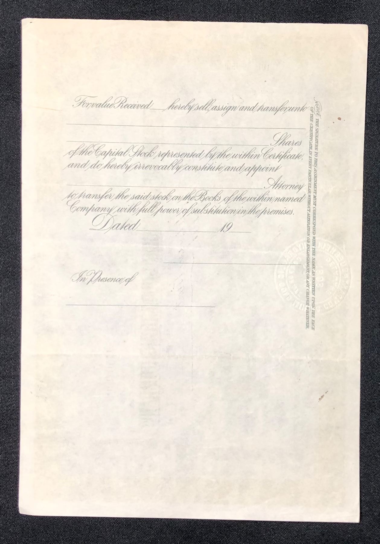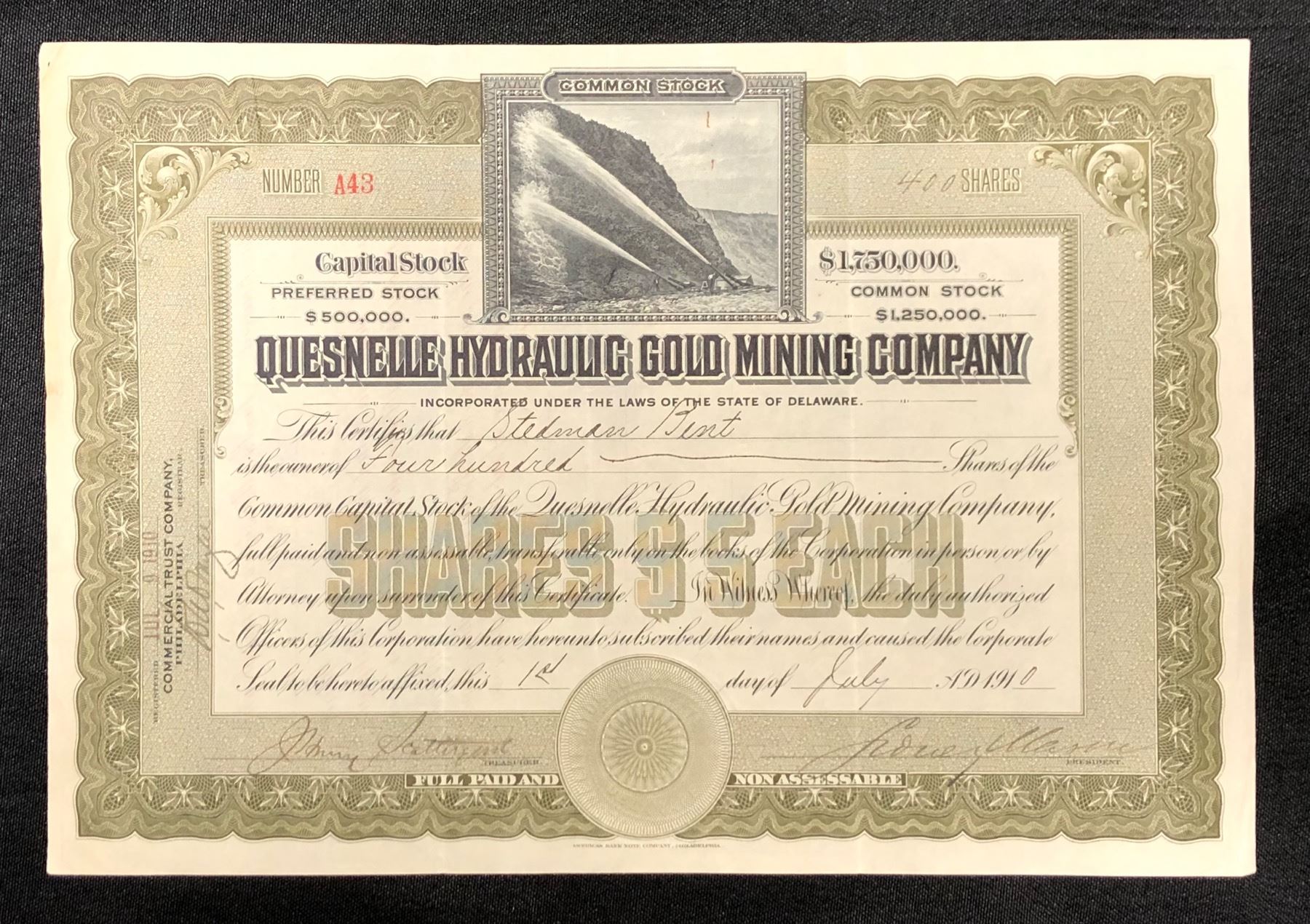 400 shares Green 1910 #A43 water jets spraying hillside VF-EF exceptionally rare British Columbia mining certificate. This company minded for gold along the Fraser River near the town of Quesnel in central British Columbia. They employed high pressure jets of water (hydraulic) against the hills to wash away the dirt, then separate the dirt from the gold by sluicing.