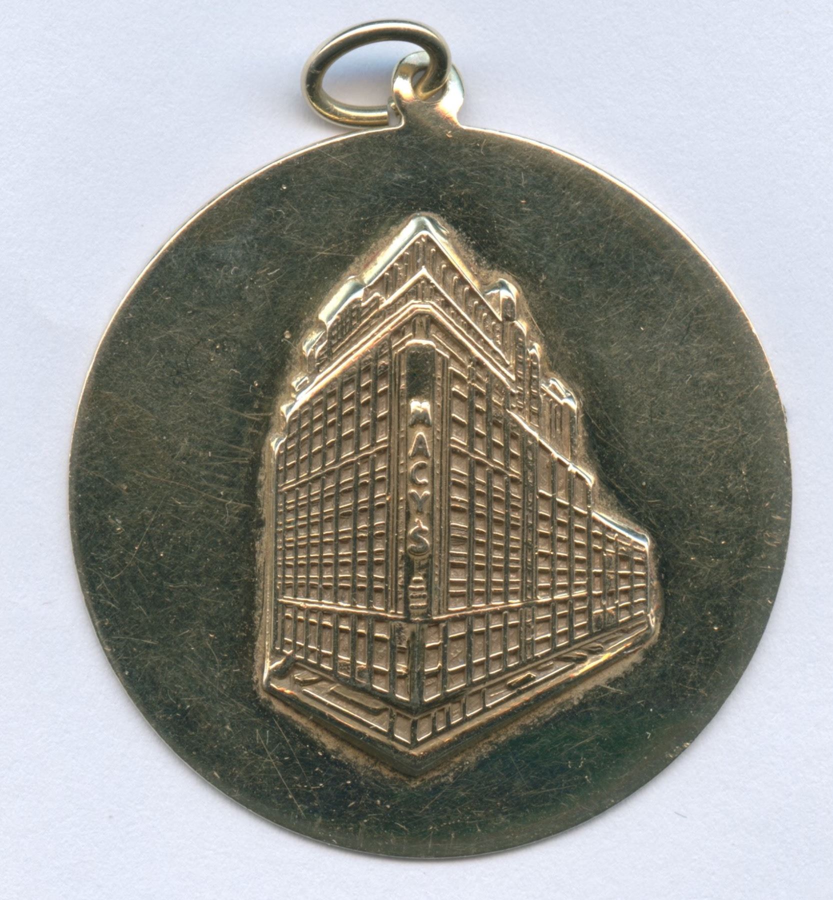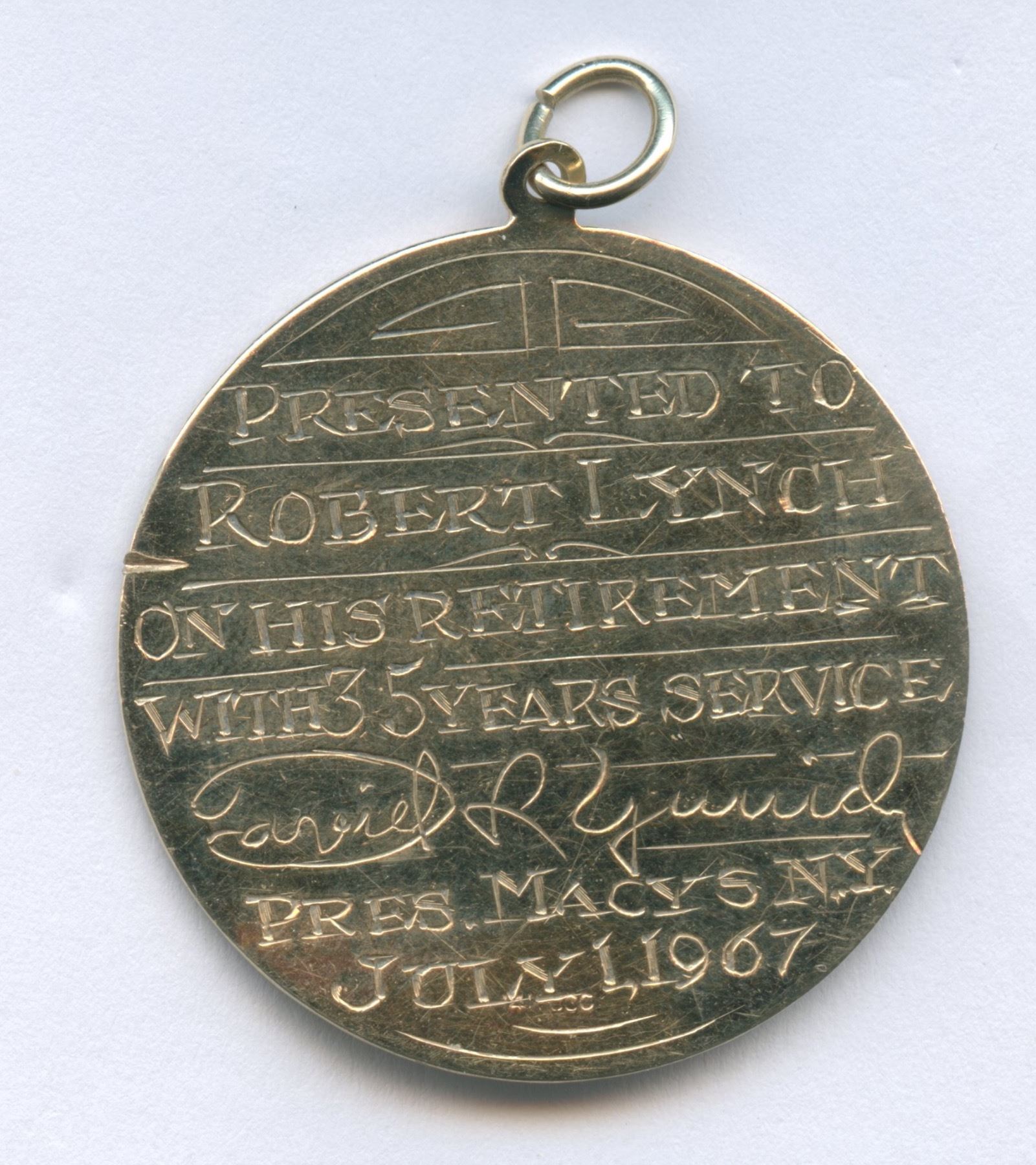 Gold, 14 kt (AGW 0.146). 30mm, 7.8g. Looped at top. Obv: Side view of Macy's building at 34th Street and 7th Avenue; Rev: Engraved on 7 lines - "PRESENTED TO/ROBERT LYNCH/ON HIS RETIREMENT/WITH 35 YEARS SERVICE/David L. Yunich/PRES. MACYS N.Y./ JULY 1, 1967". David Yunich was appointed as chairman of New York's Metropolitan Transportation Authority (M.T.A.) during some of the subway system's darkest days in the mid 1970's. Edge nick due to test mark.