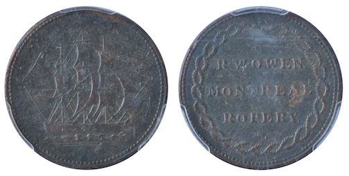 R.W. Owen Ropery BR 564, CH LC-18, copper. The rarity of this token is usually explained by Owen having sold out his Montreal rope-making business shortly after the token was issued in 1824. We sold one example in our July 2009 sale of the Rev. Dr. Bernard O’Connor collection as lot 965, graded ICCS Fine-12, for $15,000 and the same piece again as lot 930A in our October 3-4, 2013 sale where it realized $19,000. The two examples in the Stack’s Bowers sale of the John J. Ford, Jr., collection in August 2013, both of which were choice mint state, were hammered down at $45,000 and $37,500 USD. The present example is graded VF by PCGS with some scratches and digs, especially to the obverse through the ship, above the flag at the stern, and at the top foremast. A rare token to begin with and especially so in a presentable grade as here. Ex John Temple.