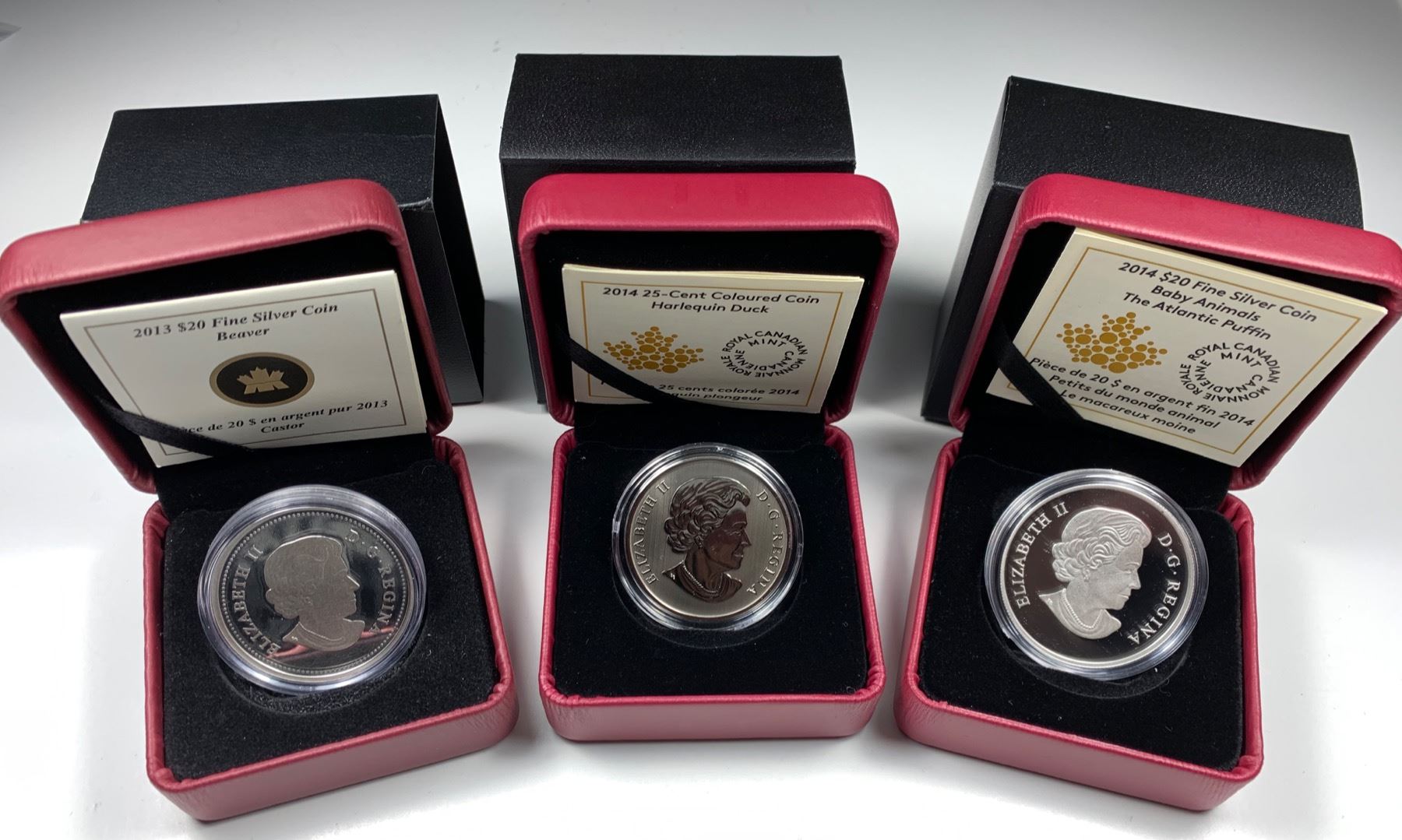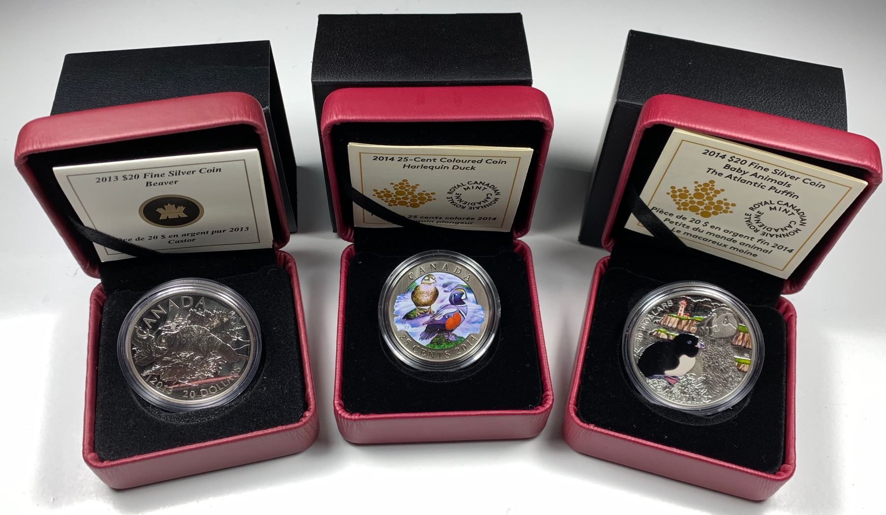 Includes: 2013 $20 Canada THE BEAVER FINE SILVER COIN (NO TAX) - Fine Silver - Mintage: 8,500 - With Box, sleeve, and COA - RCM 123784 - Issue price $99.95; 2014 25-CENT Canada DUCKS OF CANADA - HARLEQUIN DUCK COLOURED CUPRONICKEL COIN - Mintage: 17,500 - With Box, sleeve, and COA - RCM 130588 - Issue price $29.95; 2014 $20 Canada BABY ANIMALS - ATLANTIC PUFFIN FINE SILVER (NO TAX) - Retrieving data. Wait a few seconds and try to cut or copy again. 3 Pcs.