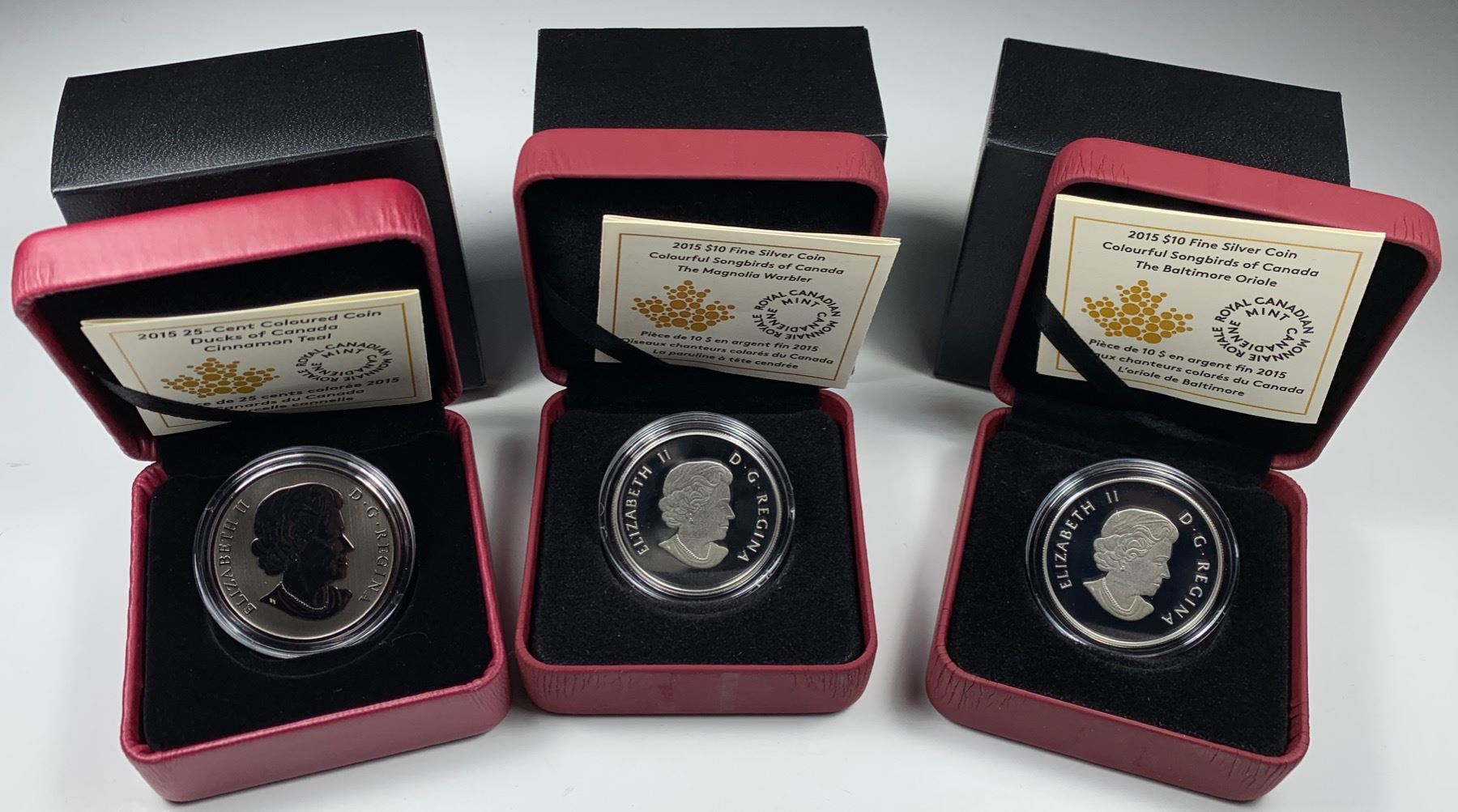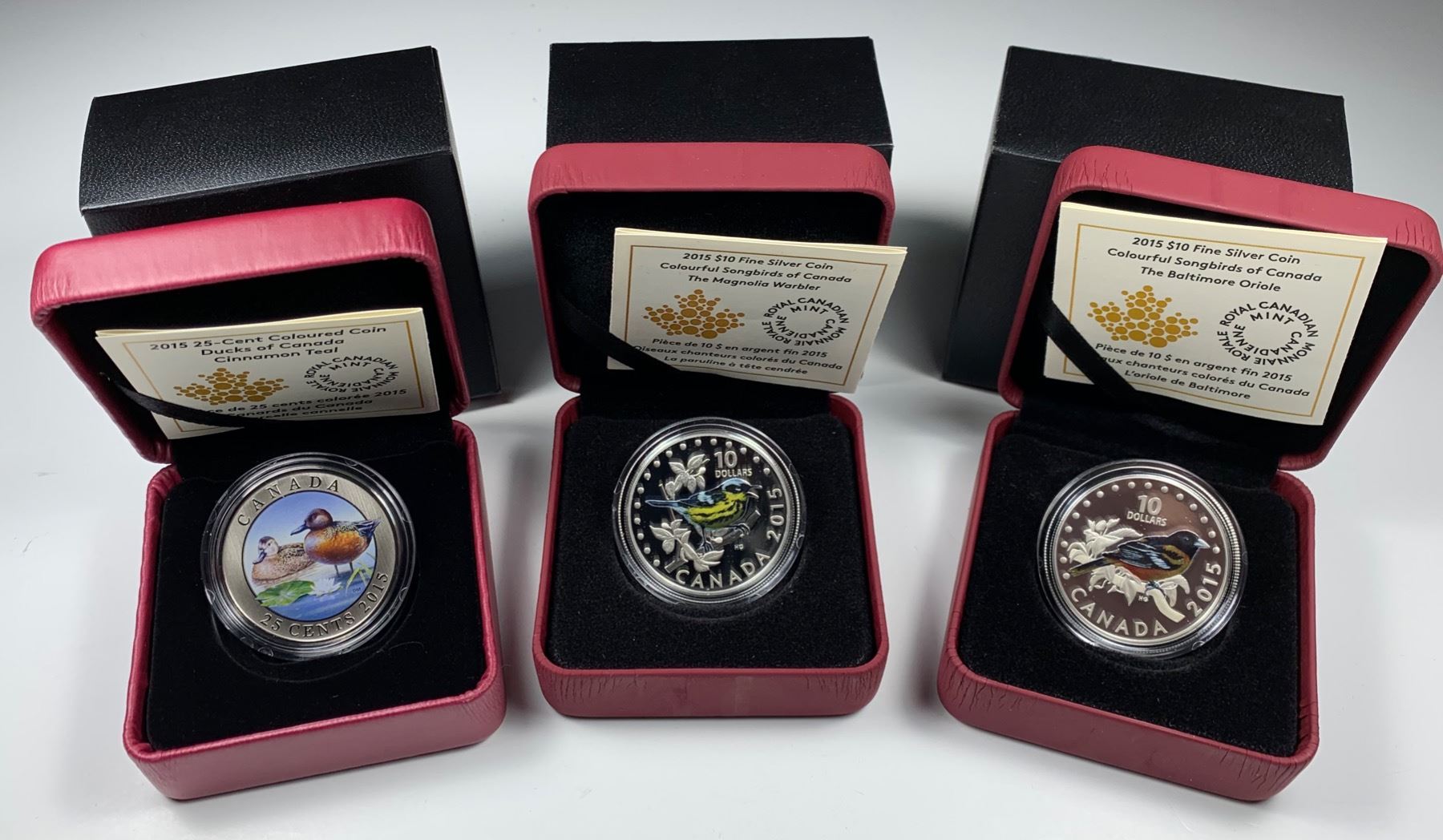 2015 25-CENT Canada DUCKS OF CANADA - CINNAMON TEAL COLOURED CUPRONICKEL COIN - Mintage: 17,500 - With Box, sleeve, and COA - RCM 132478 - Issue price $29.95; 2015 $10 Canada COLOURFUL SONGBIRDS - BALTIMORE ORIOLE (NO TAX) - Fine Silver - Mintage: 15,000 - With Box, sleeve, and COA - RCM 146455 - Issue price $64.95; 2015 $10 Canada COLOURFUL SONGBIRDS - THE MAGNOLIA WARBLER (NO TAX) - Fine Silver - Mintage: 15,000 - With Box, sleeve, and COA - RCM 142260 - Issue price $64.95. 3 Pcs.