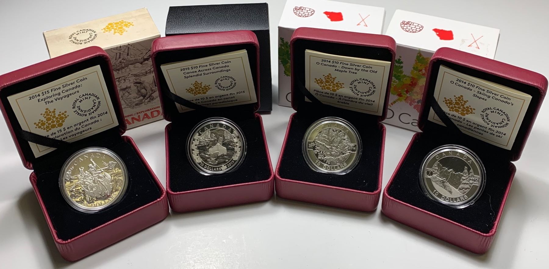 2014 $15 Exploring Canada - The Voyagers; 2014 $10 O Canada - Skiing Canada's Slopes; 2014 O Canada - Down by the Old Maple Tree; 2015 $10 Canoe Across Canada - Splendid Surroundings. All in original cases with COAs. 4 Pcs.