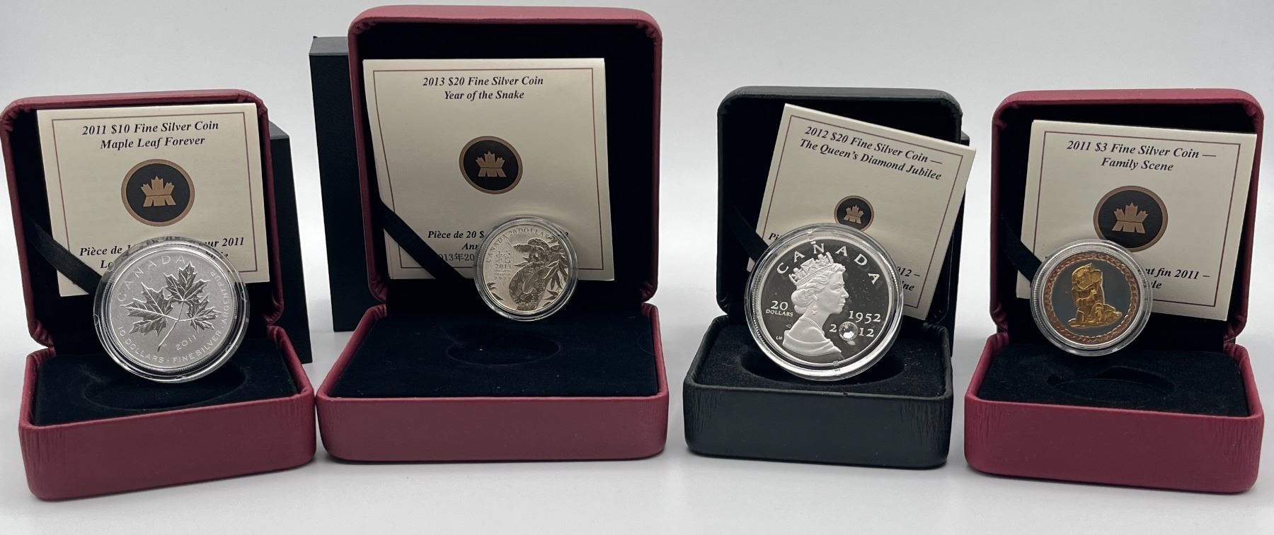 Includes: 2011 $3 Family Scene #1, 2011 Maple Leaf Forever $10, 2012 The Queen's Diamond Jubilee (with Crystal) $20, 2013 Year of the Snake $20. 4 pcs.