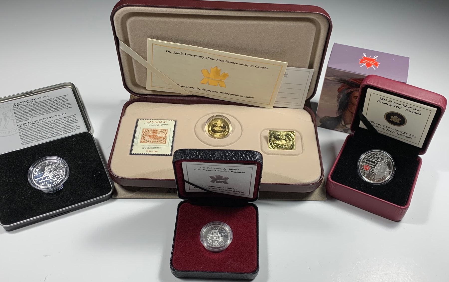 2012 Canada $4 Heroes of 1812: Tecumseh, 2000 Voltigeurs de Quebec Proof 5¢, 2001 150th Anniversary of the First Postage Stamp Set & 2000 Sterling Hockey 50¢. In original case with COA's. The Hockey case is dented. 4 Pcs.
